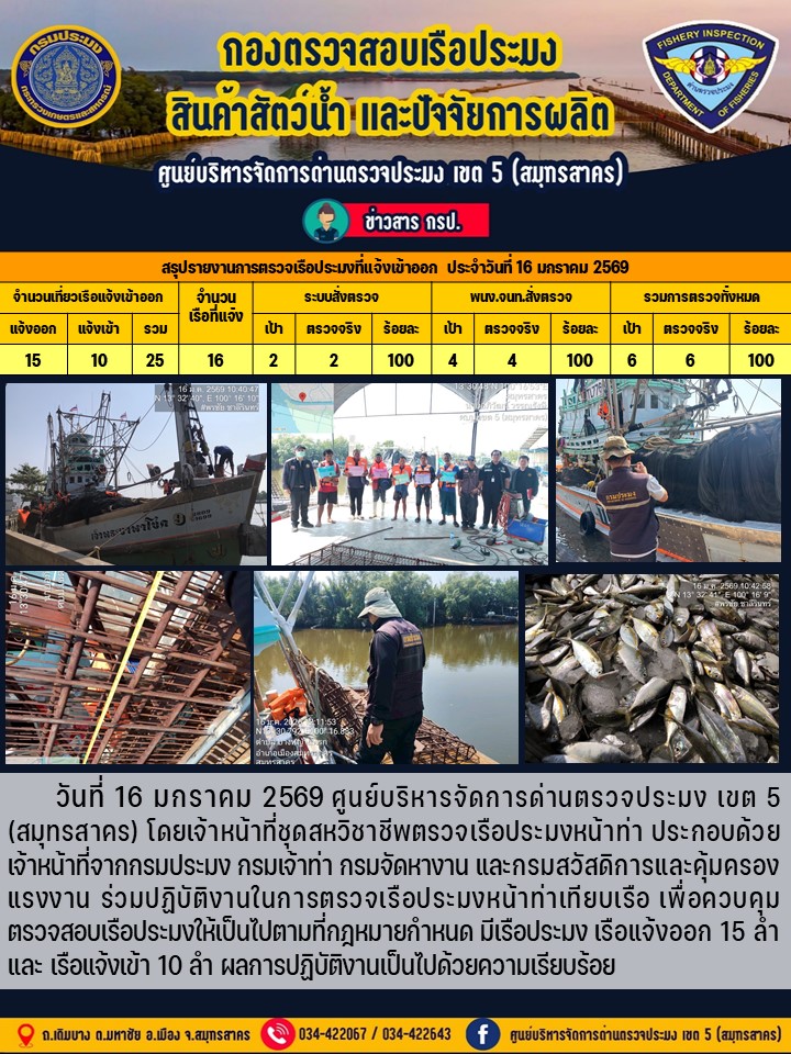 รายงานการตรวจเรือประมงที่แจ้งเข้าออกประจำวันที่ 16 มกราคม 2569