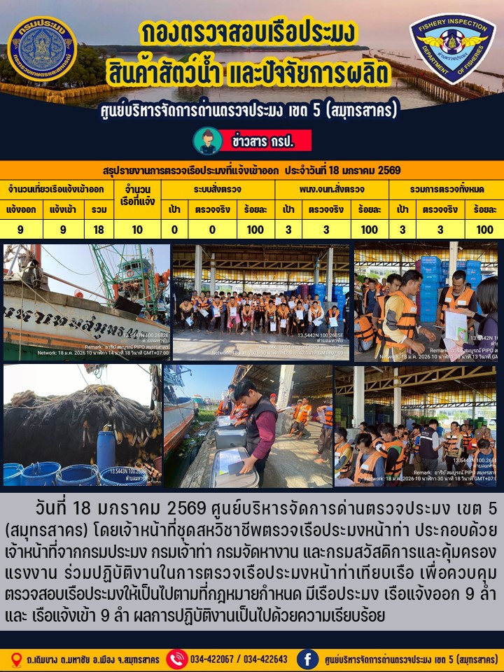 รายงานการตรวจเรือประมงที่แจ้งเข้าออกประจำวันที่ 18 มกราคม 2569