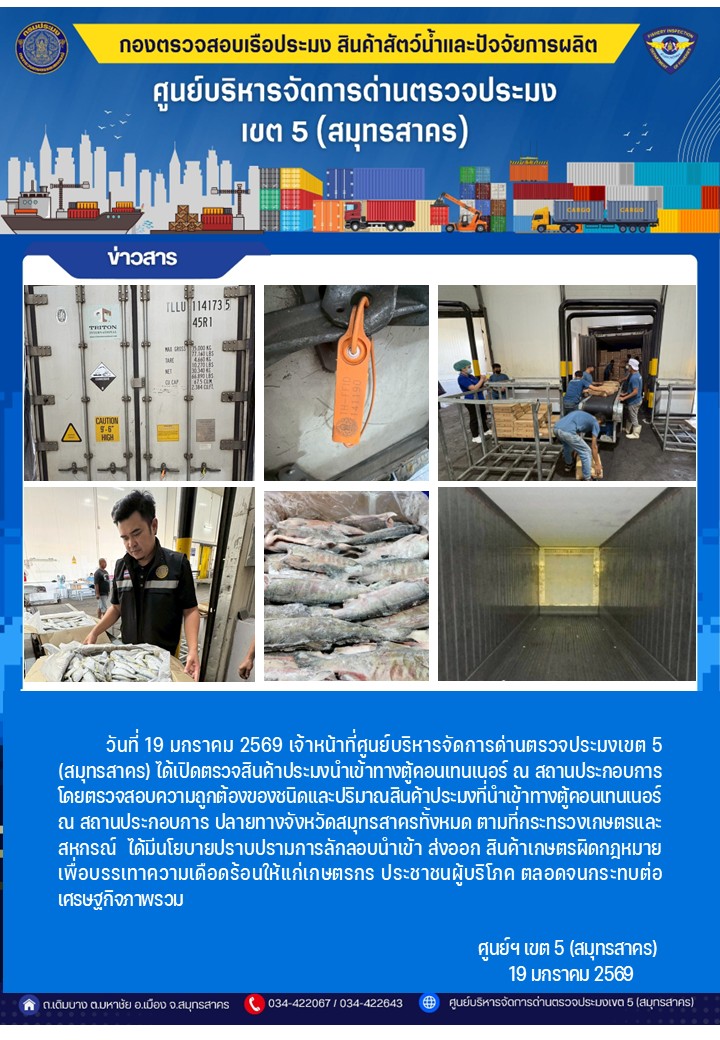 วันที่ 19 มกราคม 2569 เจ้าหน้าที่ศูนย์บริหารจัดการด่านตรวจประมงเขต5 (สมุทรสาคร) ได้เปิดตรวจสินค้าประมงนำเข้าทางตู้คอนเทนเนอร์ ณ สถานประกอบการ