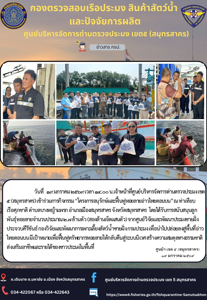 เมื่อ 19 ม.ค. 69 จนท.ศูนย์บริหารจัดการด่านตรวจประมงสมุทรสาคร เข้าร่วมกิจกรรม "โครงการอนุรักษ์และฟื้นฟูหอยลายอ่าวไทยตอนบน"