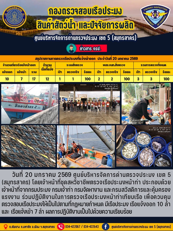 รายงานการตรวจเรือประมงที่แจ้งเข้าออกประจำวันที่ 20 มกราคม 2569
