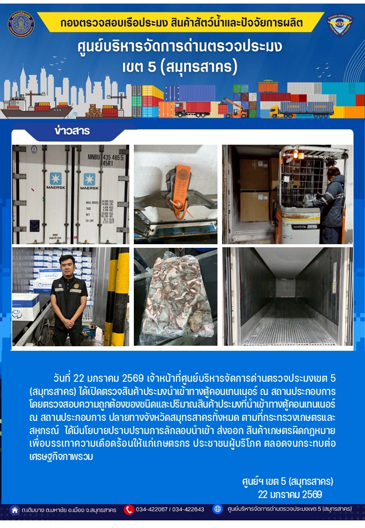 วันที่ 22 มกราคม 2569 เจ้าหน้าที่ศูนย์บริหารจัดการด่านตรวจประมงเขต5 (สมุทรสาคร) ได้เปิดตรวจสินค้าประมงนำเข้าทางตู้คอนเทนเนอร์ ณ สถานประกอบการ