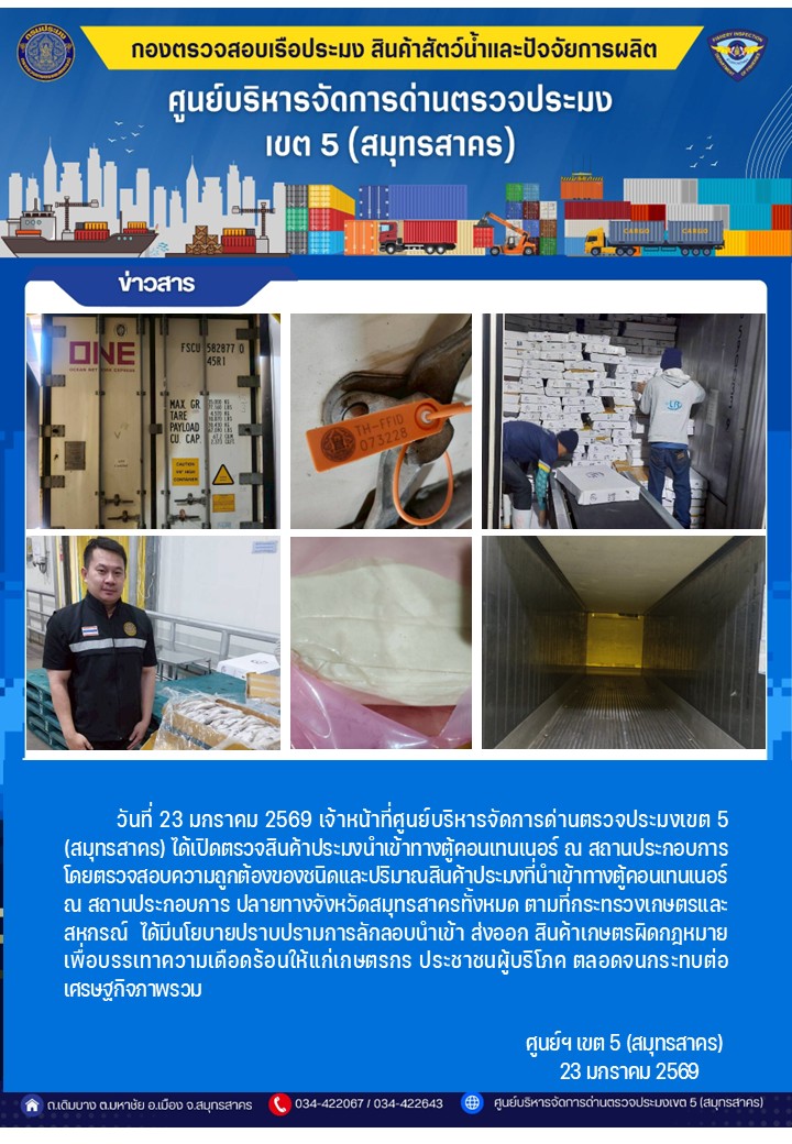 วันที่ 23 มกราคม 2569 เจ้าหน้าที่ศูนย์บริหารจัดการด่านตรวจประมงเขต5 (สมุทรสาคร) ได้เปิดตรวจสินค้าประมงนำเข้าทางตู้คอนเทนเนอร์ ณ สถานประกอบการ