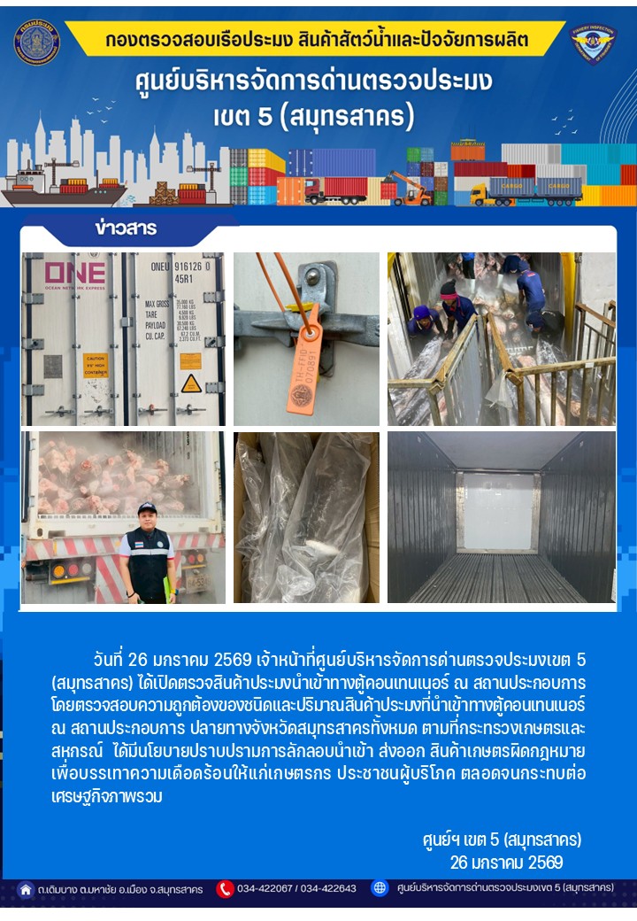 วันที่ 26 มกราคม 2569 เจ้าหน้าที่ศูนย์บริหารจัดการด่านตรวจประมงเขต5 (สมุทรสาคร) ได้เปิดตรวจสินค้าประมงนำเข้าทางตู้คอนเทนเนอร์ ณ สถานประกอบการ