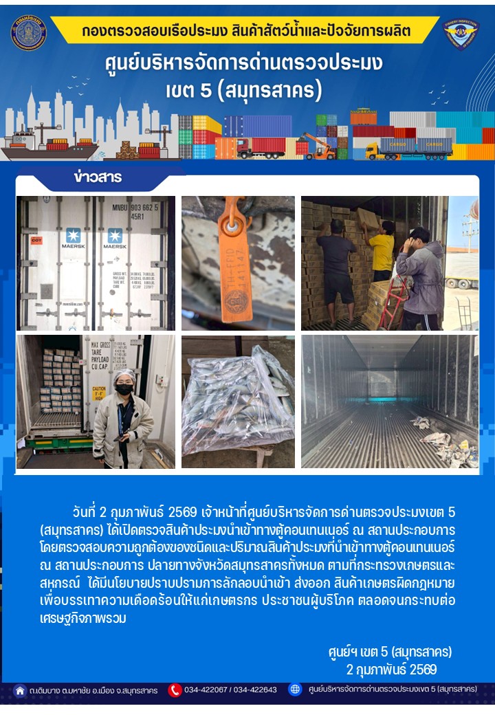 วันที่ 2 กุมภาพันธ์ 2569 เจ้าหน้าที่ศูนย์บริหารจัดการด่านตรวจประมงเขต5 (สมุทรสาคร) ได้เปิดตรวจสินค้าประมงนำเข้าทางตู้คอนเทนเนอร์ ณ สถานประกอบการ