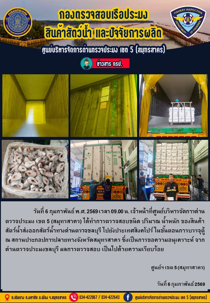 วันที่ 6 กุมภาพันธ์ 2569 เจ้าหน้าที่ศูนย์บริหารจัดการด่านตรวจประมงเขต5 (สมุทรสาคร) ได้เปิดตรวจสินค้าประมงส่งออกทางตู้คอนเทนเนอร์ ณ สถานประกอบการ