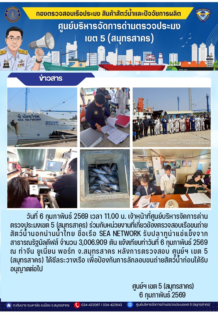 [2026-02-09] รายงานการตรวจเรือประมงที่แจ้งเข้าออกประจำวันที่ 7 กุมภาพันธ์ 2569.. [2026-02-09] การขนถ่ายทูน่าแช่แข็งจากเรือขนถ่ายสัตว์น้ำสัญชาติไทย เรือ SEA NETWORK.. [2026-02-09] วันที่ 6 กุมภาพันธ์ 2569 เจ้าหน้าที่ศูนย์บริหารจัดการด่านตรวจประมงเขต5.. [2026-02-09] รายงานการตรวจเรือประมงที่แจ้งเข้าออกประจำวันที่ 6 กุมภาพันธ์ 2569.. [2026-02-09] วันที่ 5 กุมภาพันธ์ 2569 เจ้าหน้าที่ศูนย์บริหารจัดการด่านตรวจประมงเขต5.. [2026-02-09] รายงานการตรวจเรือประมงที่แจ้งเข้าออกประจำวันที่ 5 กุมภาพันธ์ 2569.. [2026-02-09] วันที่ 4 กุมภาพันธ์ 2569 เจ้าหน้าที่ศูนย์บริหารจัดการด่านตรวจประมงเขต5.. [2026-02-09] รายงานการตรวจเรือประมงที่แจ้งเข้าออกประจำวันที่ 4 กุมภาพันธ์ 2569.. [2026-02-09] วันที่ 3 กุมภาพันธ์ 2569 เจ้าหน้าที่ศูนย์บริหารจัดการด่านตรวจประมงเขต5.. [2026-02-09] วันที่ 2 กุมภาพันธ์ 2569 เจ้าหน้าที่ศูนย์บริหารจัดการด่านตรวจประมงเขต5.. อ่านทั้งหมด