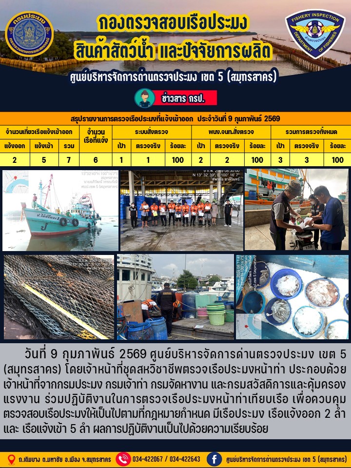 รายงานการตรวจเรือประมงที่แจ้งเข้าออกประจำวันที่ 9 กุมภาพันธ์ 2569