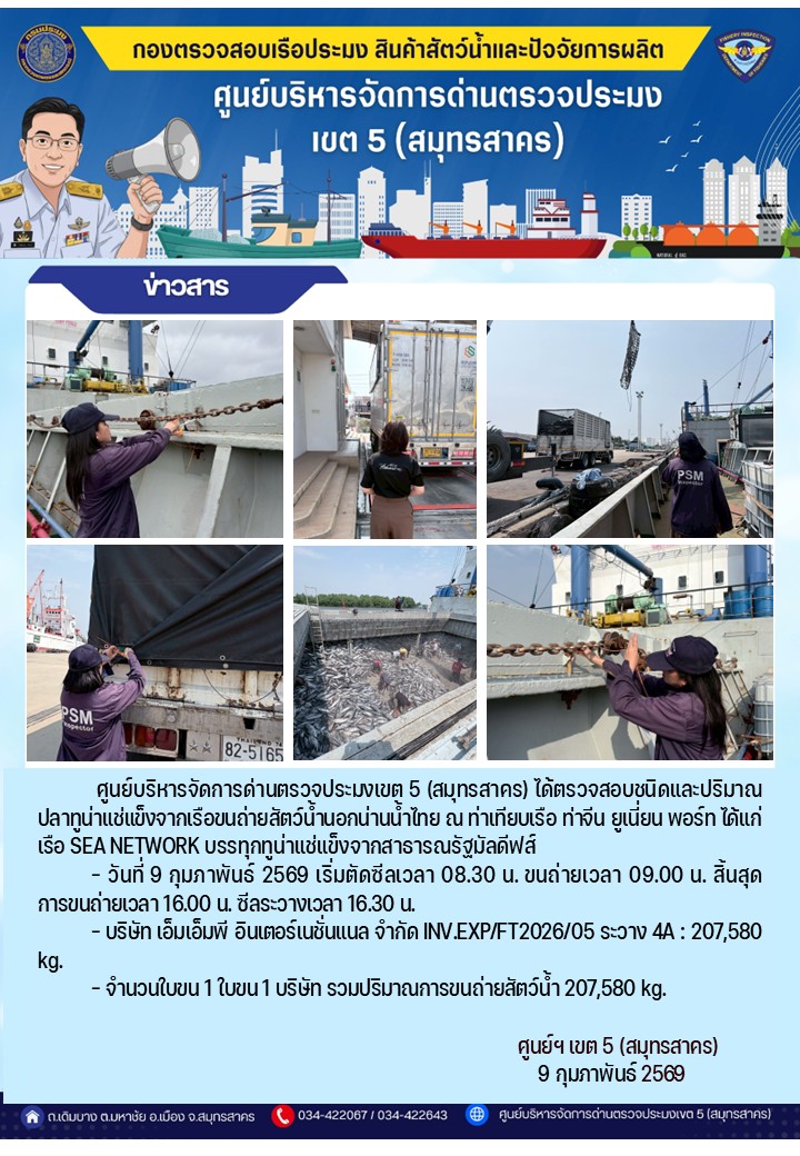 [2026-02-13] การขนถ่ายทูน่าแช่แข็งจากเรือขนถ่ายสัตว์น้ำสัญชาติไทย เรือ SEA NETWORK.. [2026-02-13] วันที่ 10 กุมภาพันธ์ 2569 เจ้าหน้าที่ศูนย์บริหารจัดการด่านตรวจประมงเขต.. [2026-02-13] การขนถ่ายทูน่าแช่แข็งจากเรือขนถ่ายสัตว์น้ำสัญชาติไทย เรือ SEA NETWORK.. [2026-02-11] รายงานการตรวจเรือประมงที่แจ้งเข้าออกประจำวันที่ 9 กุมภาพันธ์ 2569.. [2026-02-11] รายงานการตรวจเรือประมงที่แจ้งเข้าออกประจำวันที่ 8 กุมภาพันธ์ 2569.. [2026-02-11] ประชาสัมพันธ์ กำหนดพื้นที่และระยะเวลาฤดูสัตว์น้ำมีไข่ เลี้ยงตัวอ่อน ใน.. [2026-02-09] รายงานการตรวจเรือประมงที่แจ้งเข้าออกประจำวันที่ 7 กุมภาพันธ์ 2569.. [2026-02-09] การขนถ่ายทูน่าแช่แข็งจากเรือขนถ่ายสัตว์น้ำสัญชาติไทย เรือ SEA NETWORK.. [2026-02-09] วันที่ 6 กุมภาพันธ์ 2569 เจ้าหน้าที่ศูนย์บริหารจัดการด่านตรวจประมงเขต5.. [2026-02-09] รายงานการตรวจเรือประมงที่แจ้งเข้าออกประจำวันที่ 6 กุมภาพันธ์ 2569.. อ่านทั้งหมด