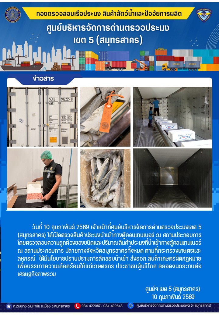 วันที่ 10 กุมภาพันธ์ 2569 เจ้าหน้าที่ศูนย์บริหารจัดการด่านตรวจประมงเขต5 (สมุทรสาคร) ได้เปิดตรวจสินค้าประมงนำเข้าทางตู้คอนเทนเนอร์ ณ สถานประกอบการ