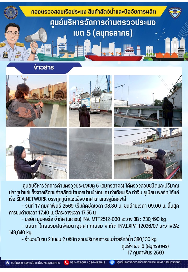 การขนถ่ายทูน่าแช่แข็งจากเรือขนถ่ายสัตว์น้ำสัญชาติไทย เรือ SEA NETWORK บรรทุกทูน่าแช่แข็งจากประเทศมัลดีฟส์ วันที่ 17 กุมภาพันธ์ 2569