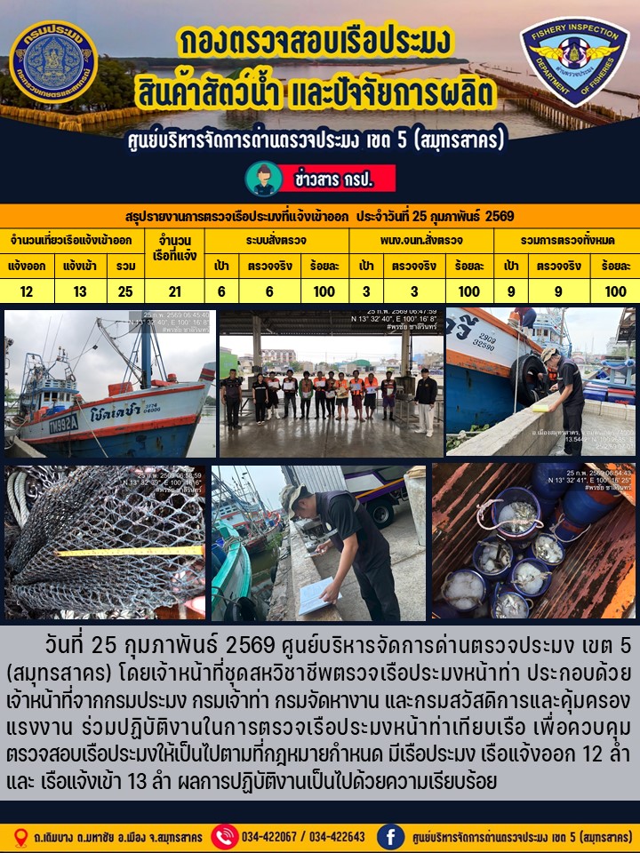 รายงานการตรวจเรือประมงที่แจ้งเข้าออกประจำวันที่ 25 กุมภาพันธ์ 2569