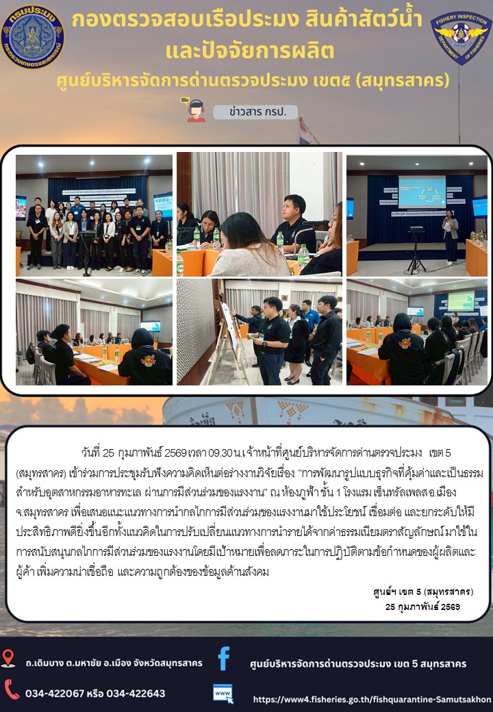 วันที่ 25 ก.พ 69 จนท.ศูนย์เขต 5 (สมุทรสาคร) เข้าร่วมการประชุมรับฟังความคิดเห็นต่อร่างงานวิจัย "การพัฒนารูปแบบธุรกิจที่คุ้มค่าและเป็นธรรมสำหรับอุตสาหกรรมอาหารทะเล ผ่านการมีส่วนร่วมของแรงงาน"