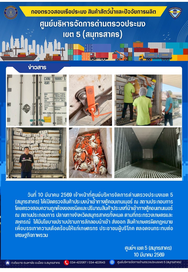 วันที่ 10 มีนาคม 2569 เจ้าหน้าที่ศูนย์บริหารจัดการด่านตรวจประมงเขต5 (สมุทรสาคร) ได้เปิดตรวจสินค้าประมงนำเข้าทางตู้คอนเทนเนอร์ ณ สถานประกอบการ