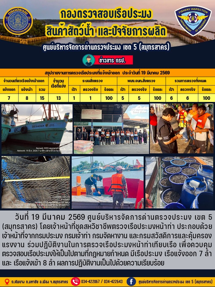 รายงานการตรวจเรือประมงที่แจ้งเข้าออกประจำวันที่ 19 มีนาคม 2569