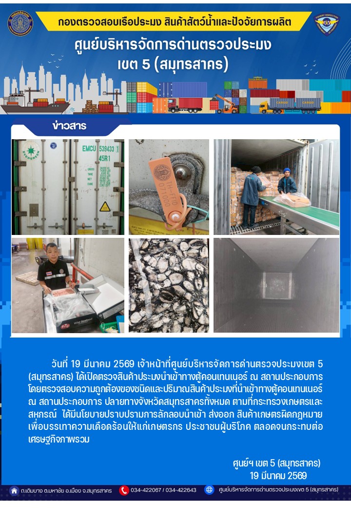 วันที่ 19 มีนาคม 2569 เจ้าหน้าที่ศูนย์บริหารจัดการด่านตรวจประมงเขต5 (สมุทรสาคร) ได้เปิดตรวจสินค้าประมงนำเข้าทางตู้คอนเทนเนอร์ ณ สถานประกอบการ