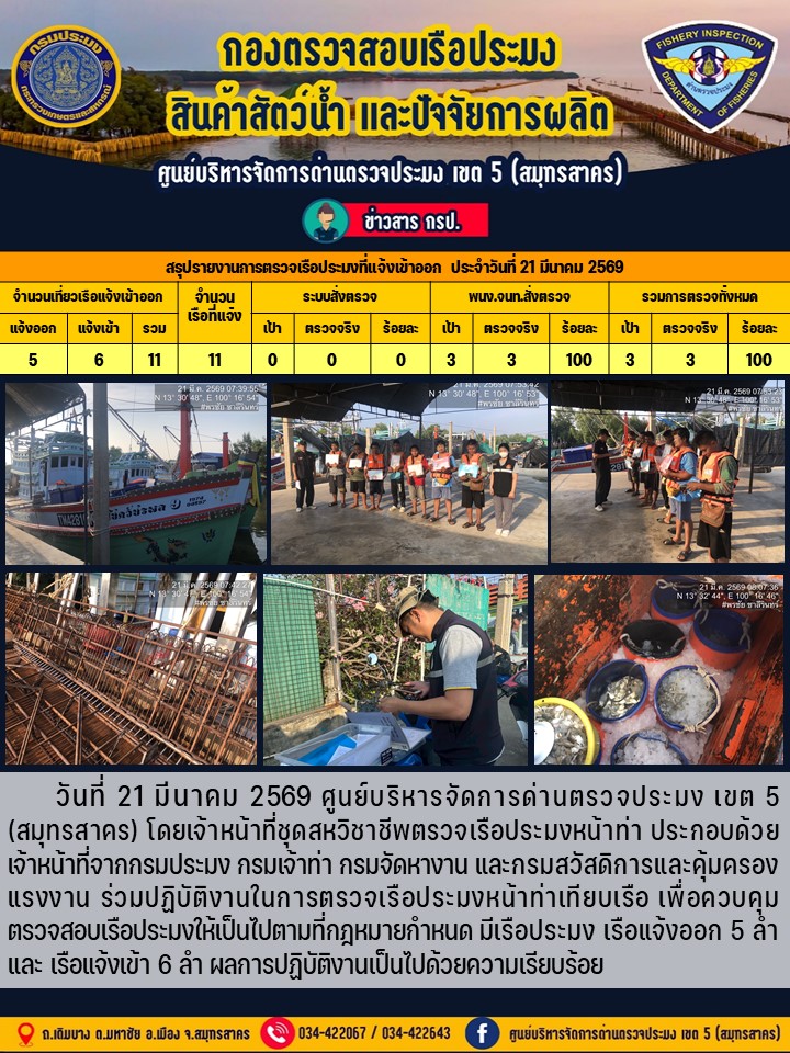 รายงานการตรวจเรือประมงที่แจ้งเข้าออกประจำวันที่ 21 มีนาคม 2569