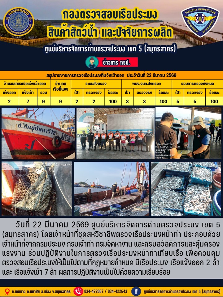 รายงานการตรวจเรือประมงที่แจ้งเข้าออกประจำวันที่ 22 มีนาคม 2569