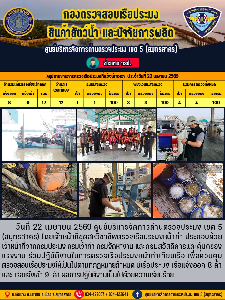 [2026-04-24] รายงานการตรวจเรือประมงที่แจ้งเข้าออกประจำวันที่ 20 เมษายน 2569.. [2026-04-24] วันที่ 21 เมษายน 2569 เจ้าหน้าที่ศูนย์บริหารจัดการด่านตรวจประมงเขต5 (ส.. [2026-04-24] รายงานการตรวจเรือประมงที่แจ้งเข้าออกประจำวันที่ 21 เมษายน 2569.. [2026-04-24] วันที่ 20 เมษายน 2569 เจ้าหน้าที่ศูนย์บริหารจัดการด่านตรวจประมงเขต5 (ส.. [2026-04-22] รายงานการตรวจเรือประมงที่แจ้งเข้าออกประจำวันที่ 20 เมษายน 2569.. [2026-04-22] วันที่ 18 เมษายน 2569 เจ้าหน้าที่ศูนย์บริหารจัดการด่านตรวจประมงเขต5 (ส.. [2026-04-22] วันที่ 17 เมษายน 2569 เจ้าหน้าที่ศูนย์บริหารจัดการด่านตรวจประมงเขต5 (ส.. [2026-04-21] รายงานการตรวจเรือประมงที่แจ้งเข้าออกประจำวันที่ 19 เมษายน 2569.. [2026-04-20] รายงานการตรวจเรือประมงที่แจ้งเข้าออกประจำวันที่ 18 เมษายน 2569.. [2026-04-20] รายงานการตรวจเรือประมงที่แจ้งเข้าออกประจำวันที่ 17 เมษายน 2569.. อ่านทั้งหมด