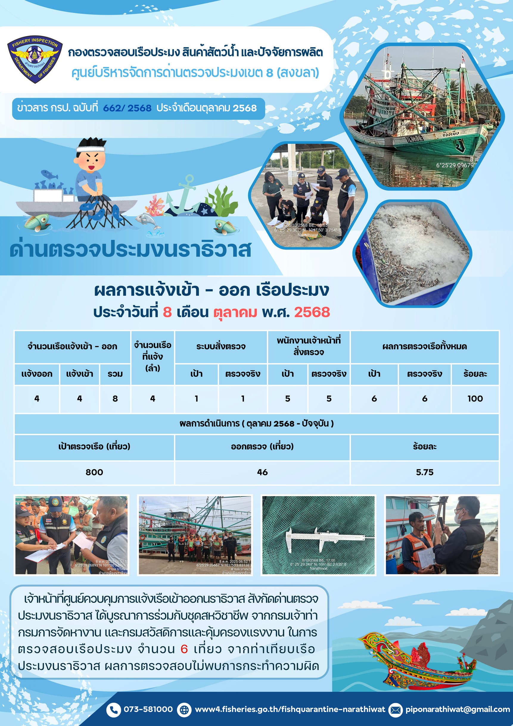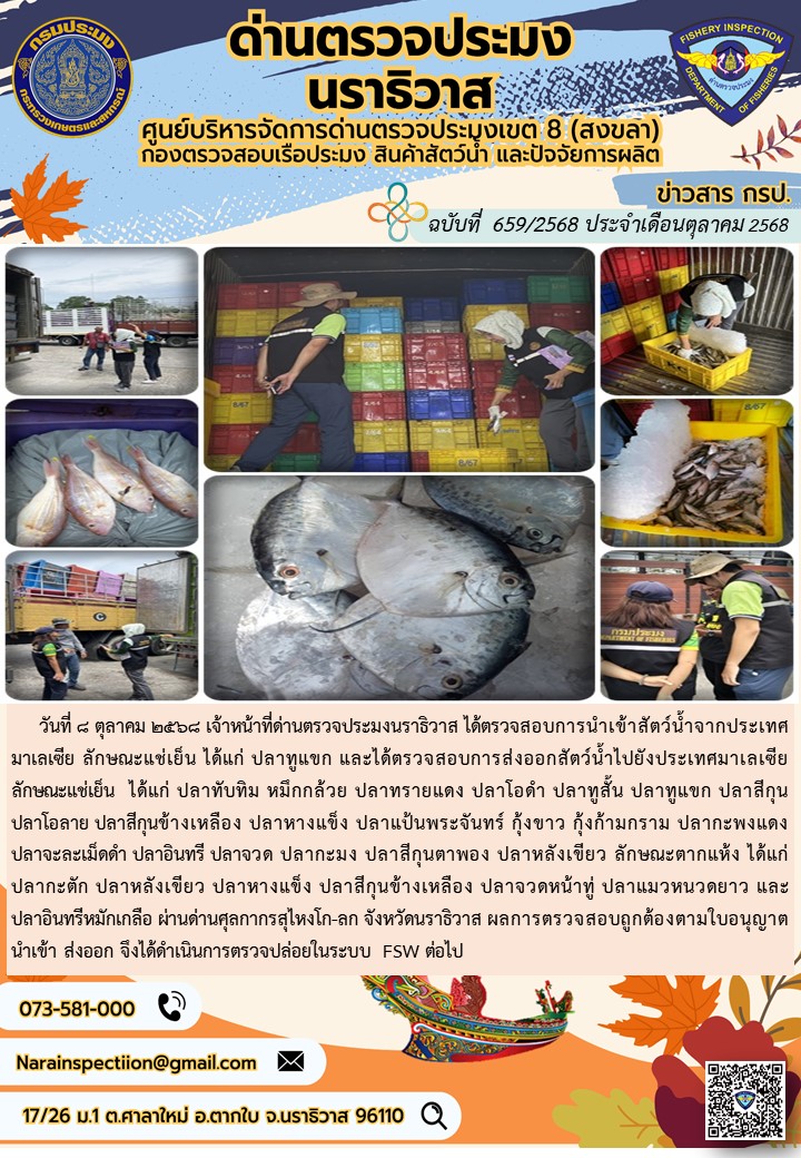 ประชาสัมพันธ์ด่านตรวจประมงนราธิวาส ประจำวันที่ 8 ตุลาคม 2568