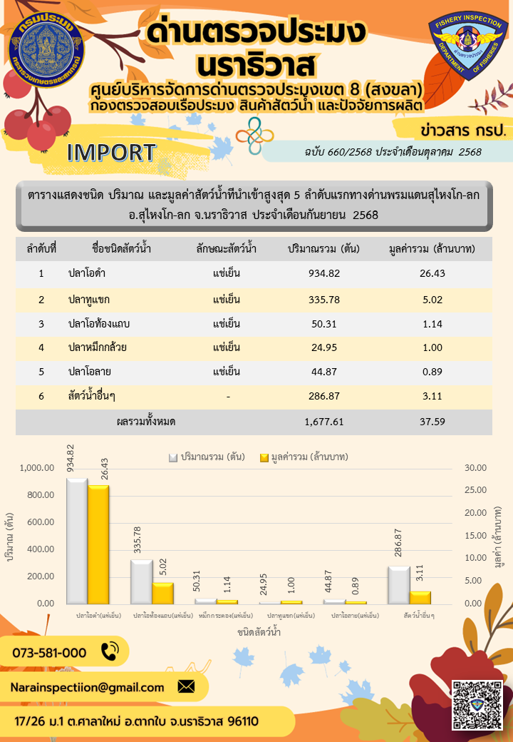 สถิติแสดงชนิดปริมาณและมูลค่าสัตว์น้ำมากที่สุด 5 ลำดับแรก ที่นำเข้า-ส่งออกทางด่านตรวจประมงนราธิวาส ประจำเดือนกันยายน 2568