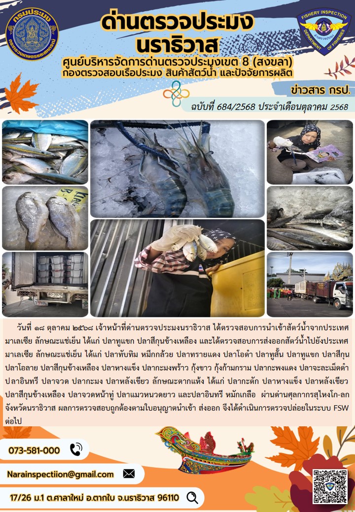 ประชาสัมพันธ์ด่านตรวจประมงนราธิวาส ประจำวันที่ 18 ตุลาคม 2568