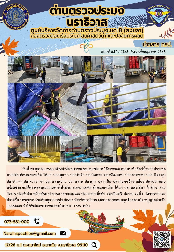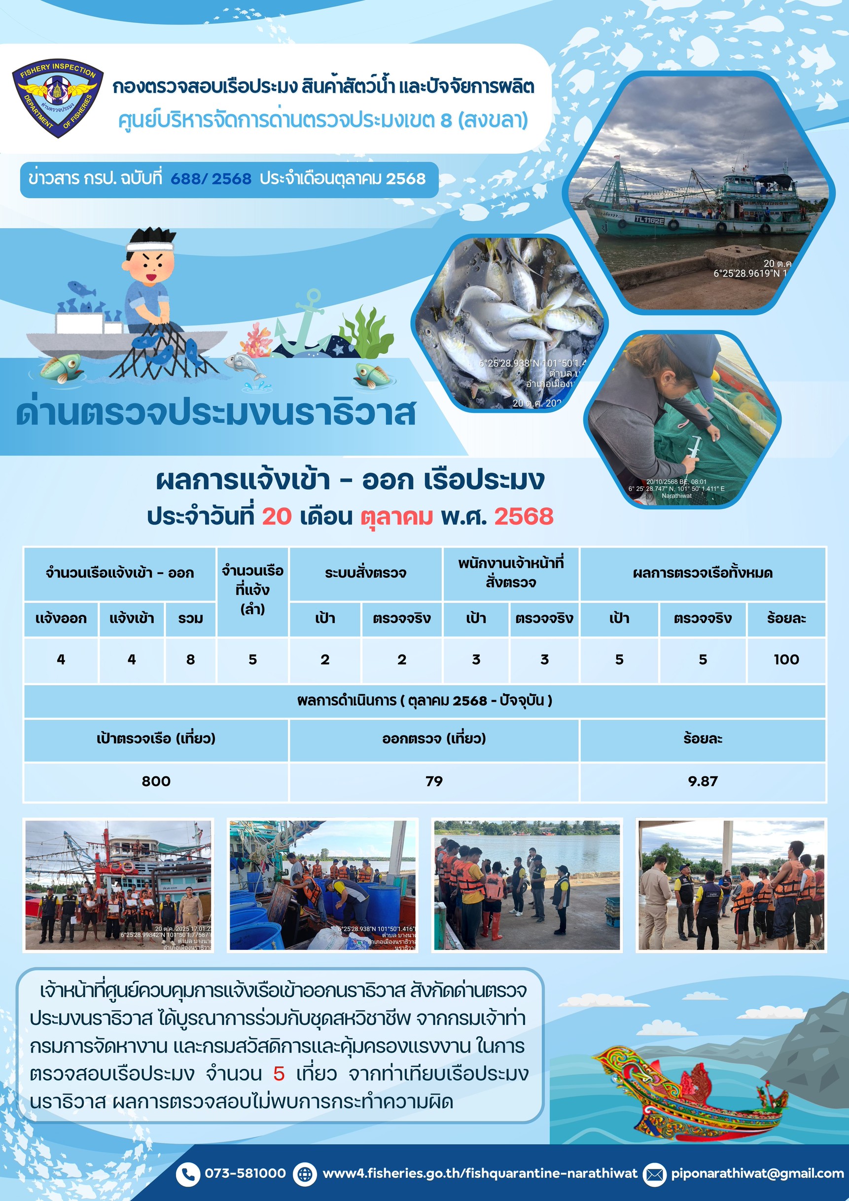 ประชาสัมพันธ์ด่านตรวจประมงนราธิวาส ประจำวันที่ 20 ตุลาคม 2568