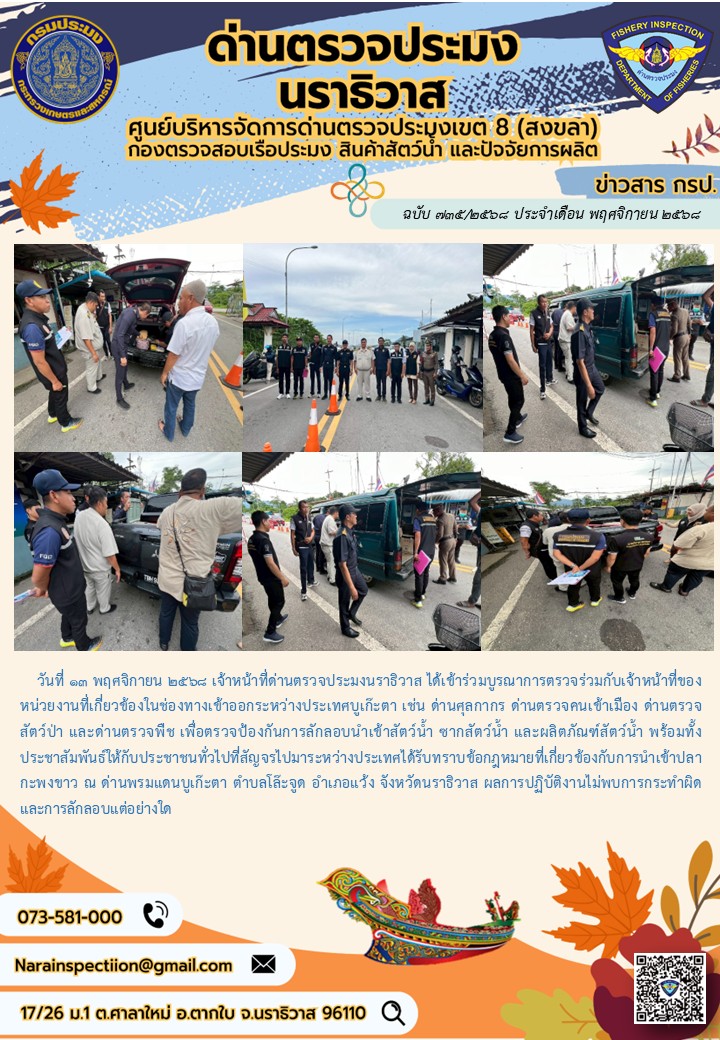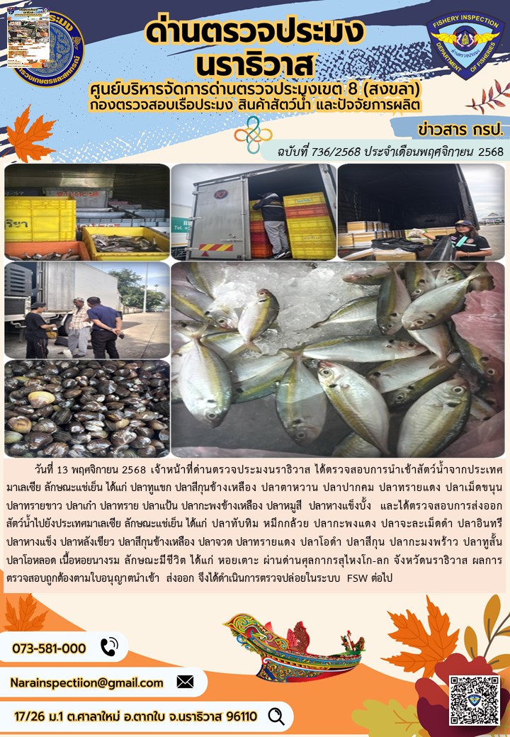 ประชาสัมพันธ์ด่านตรวจประมงนราธิวาส ประจำวันที่ 13 พฤศจิกายน 2568