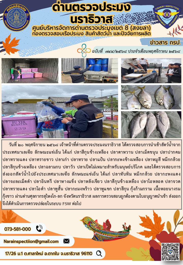 ประชาสัมพันธ์ด่านตรวจประมงนราธิวาส ประจำวันที่ 20 พฤศจิกายน 2568