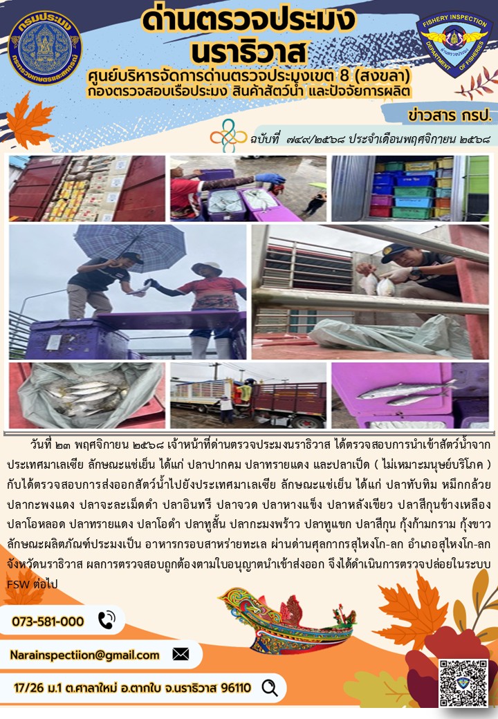 ประชาสัมพันธ์ด่านตรวจประมงนราธิวาส ประจำวันที่ 23 พฤศจิกายน 2568