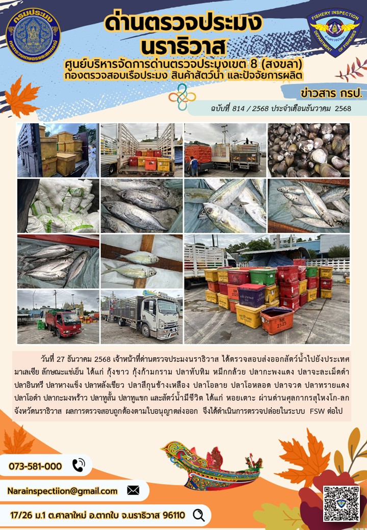 ประชาสัมพันธ์ด่านตรวจประมงนราธิวาส ประจำวันที่ 27 ธันวาคม 2568