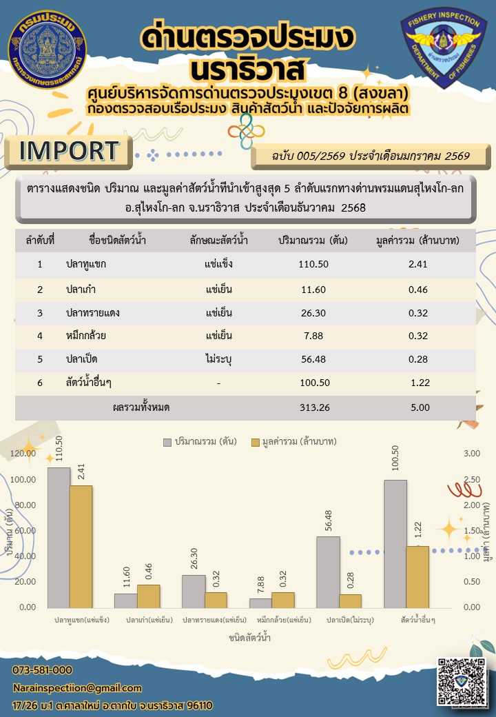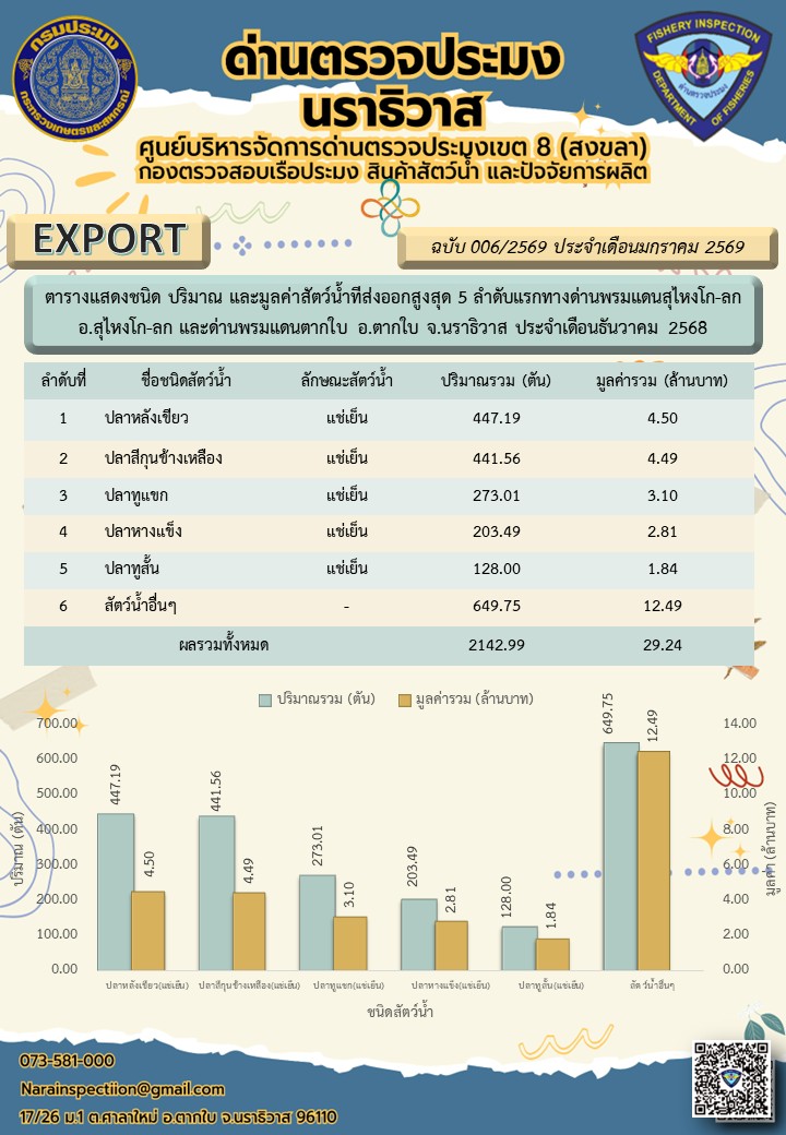 สถิติแสดงชนิดปริมาณและมูลค่าสัตว์น้ำมากที่สุด 5 ลำดับแรก ที่นำเข้า-ส่งออกทางด่านตรวจประมงนราธิวาส ประจำเดือนธันวาคม 2568