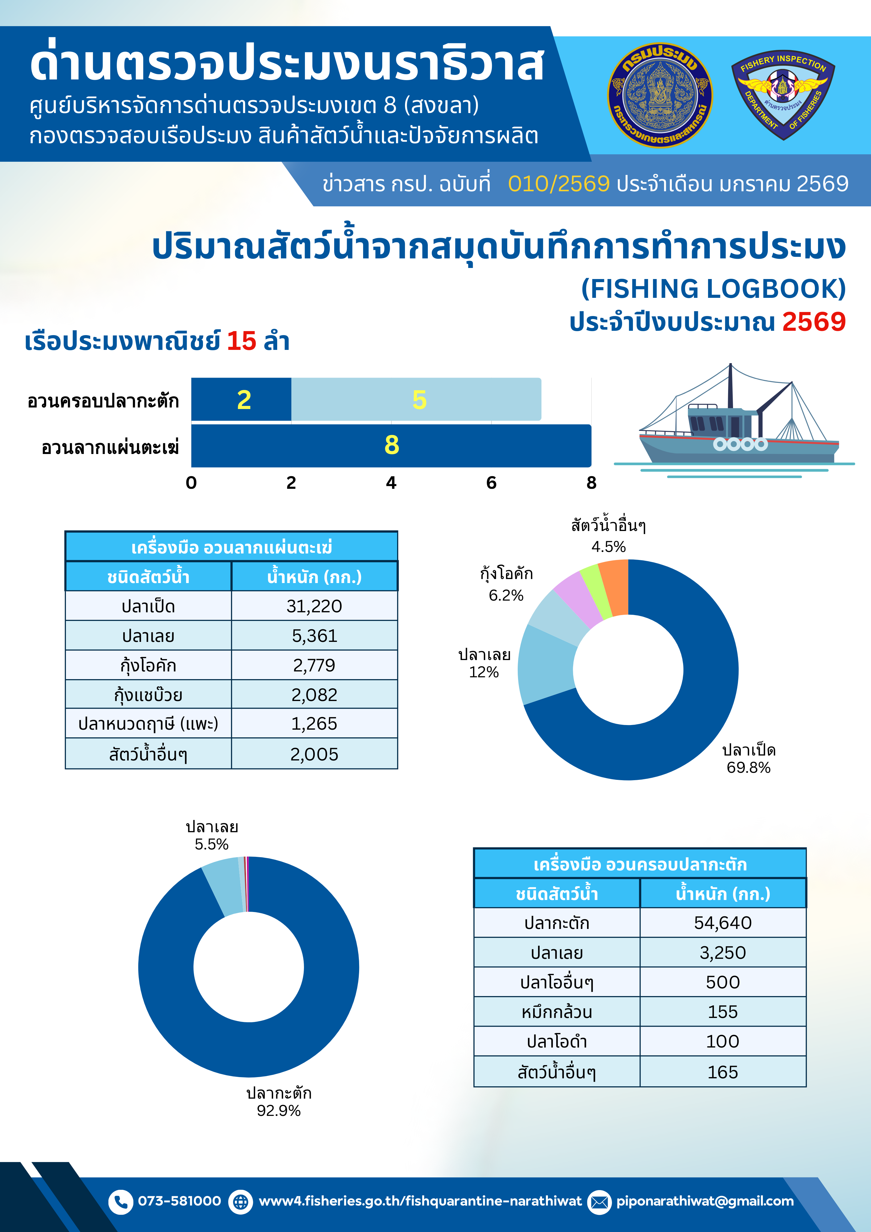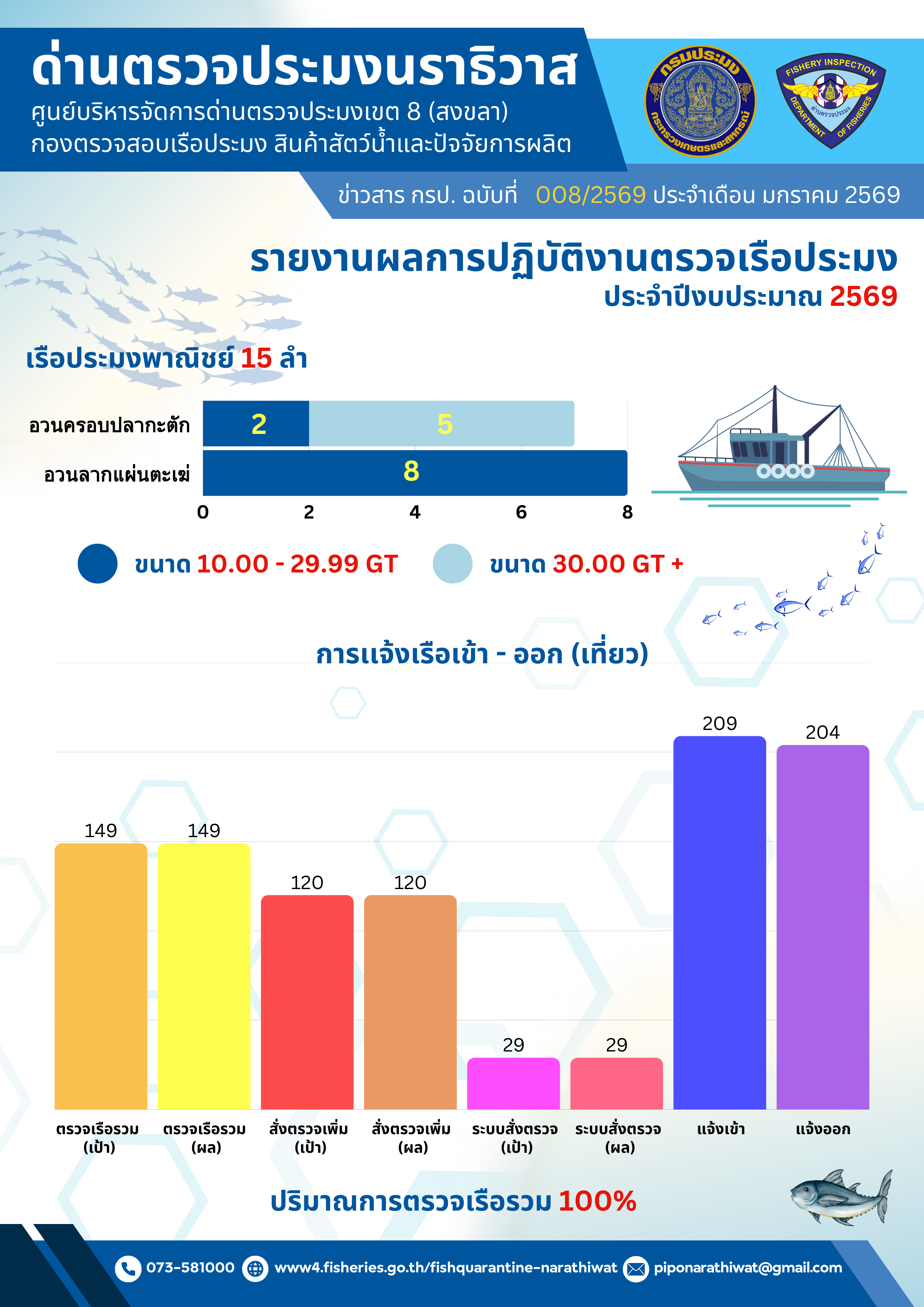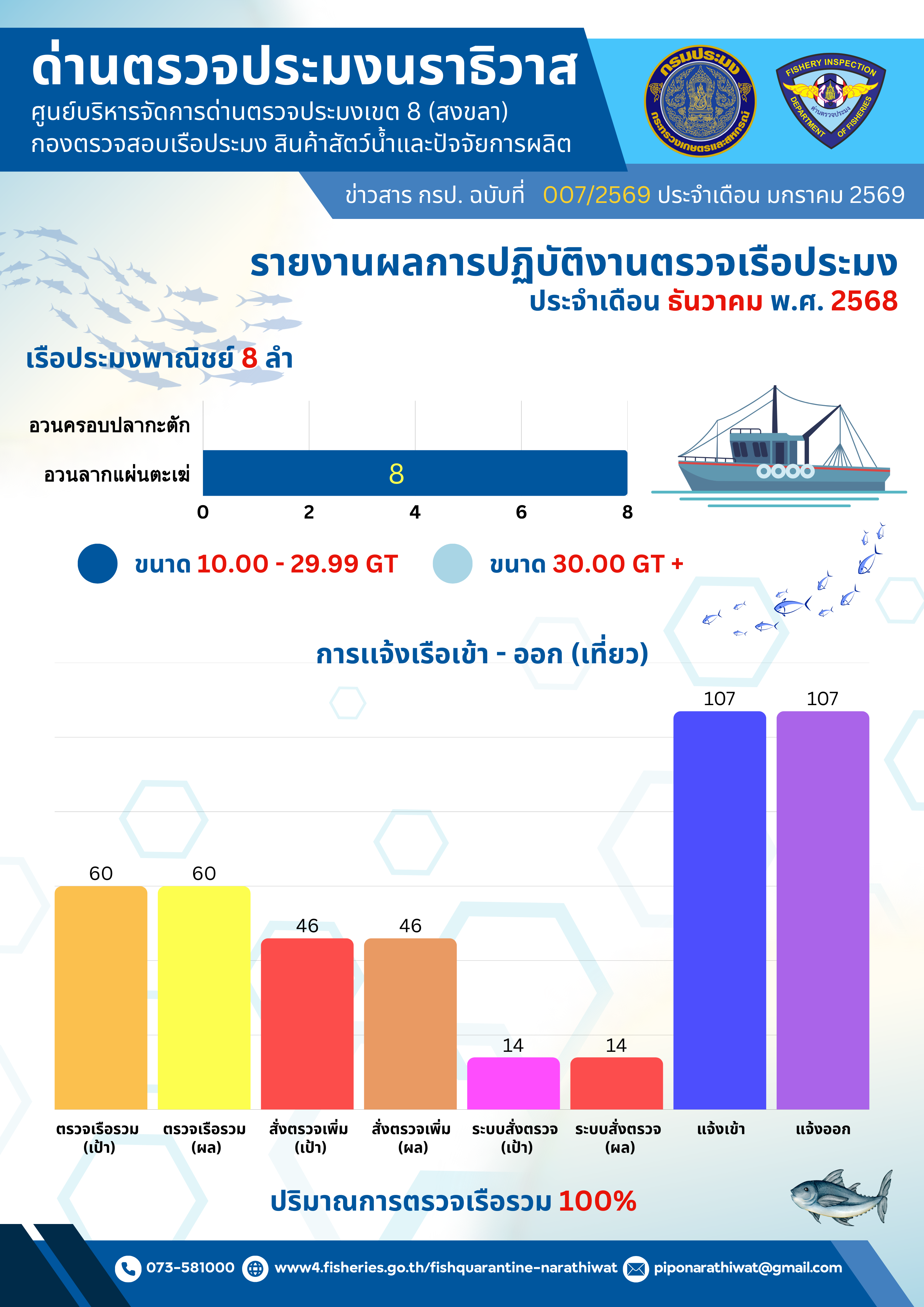 สรุปผลรายงานปริมาณสัตว์น้ำจากสมุดบันทึกการทำการประมง และรายงานผลการปฏิบัติงานตรวจเรือประมง ประจำเดือนธันวาคม 2568 และประจำปีงบประมาณ พ.ศ. 2569