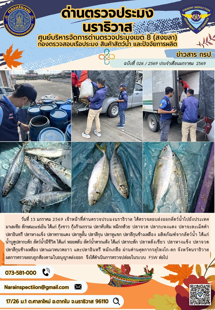 ประชาสัมพันธ์ด่านตรวจประมงนราธิวาส ประจำวันที่ 13 มกราคม 2569