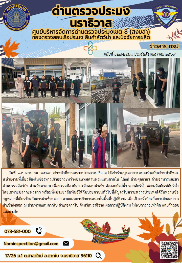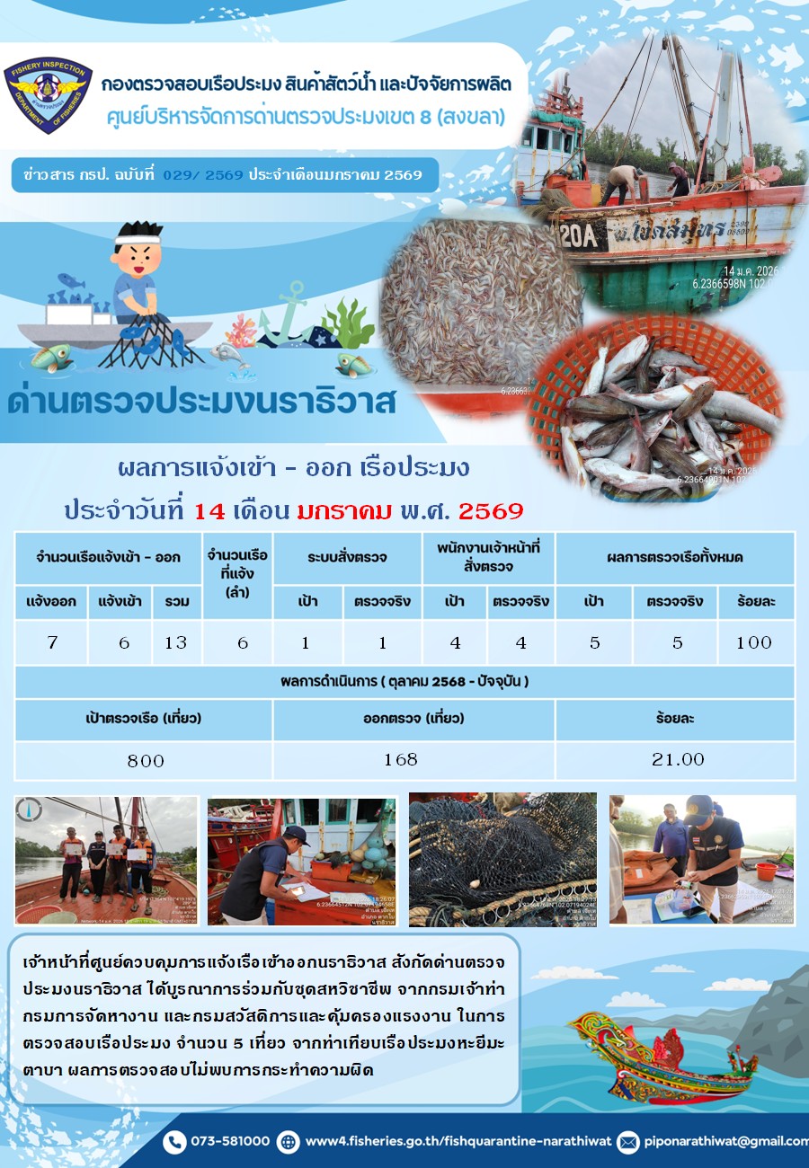 ประชาสัมพันธ์ด่านตรวจประมงนราธิวาส ประจำวันที่ 14 มกราคม 2569