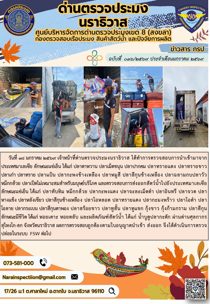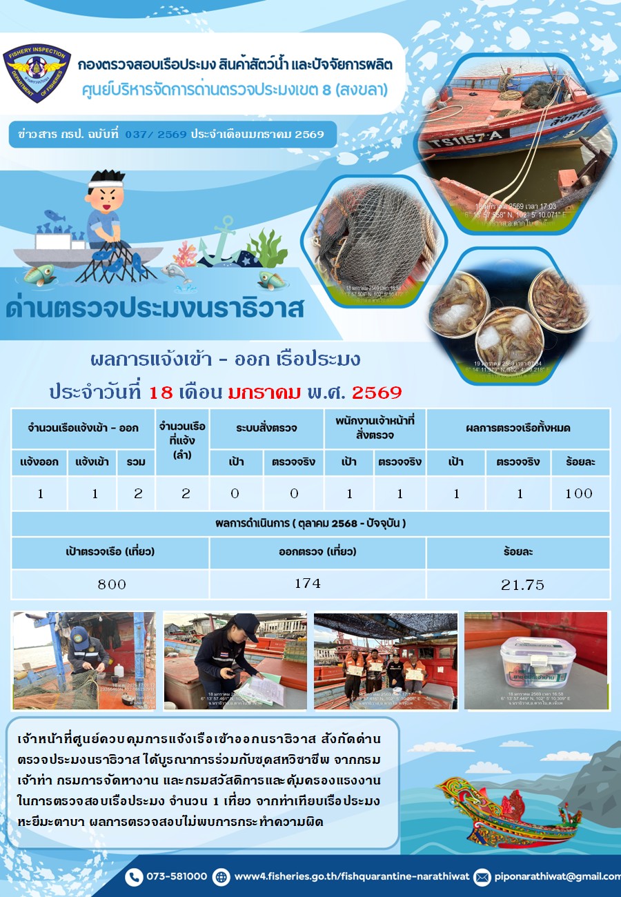 ประชาสัมพันธ์ด่านตรวจประมงนราธิวาส ประจำวันที่ 18 มกราคม 2569