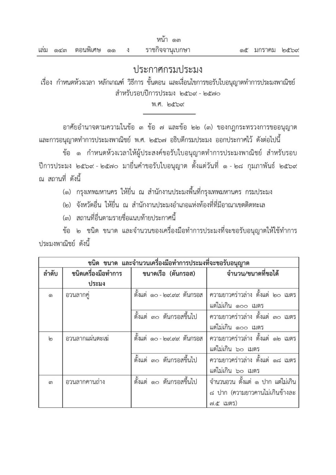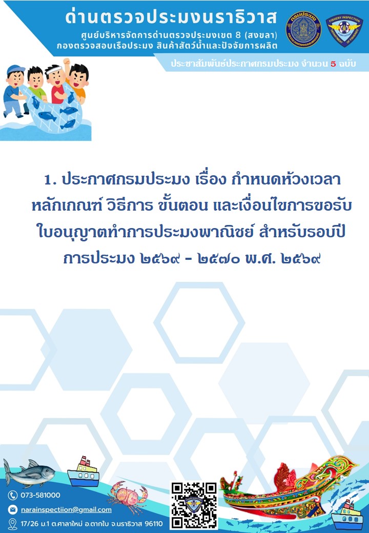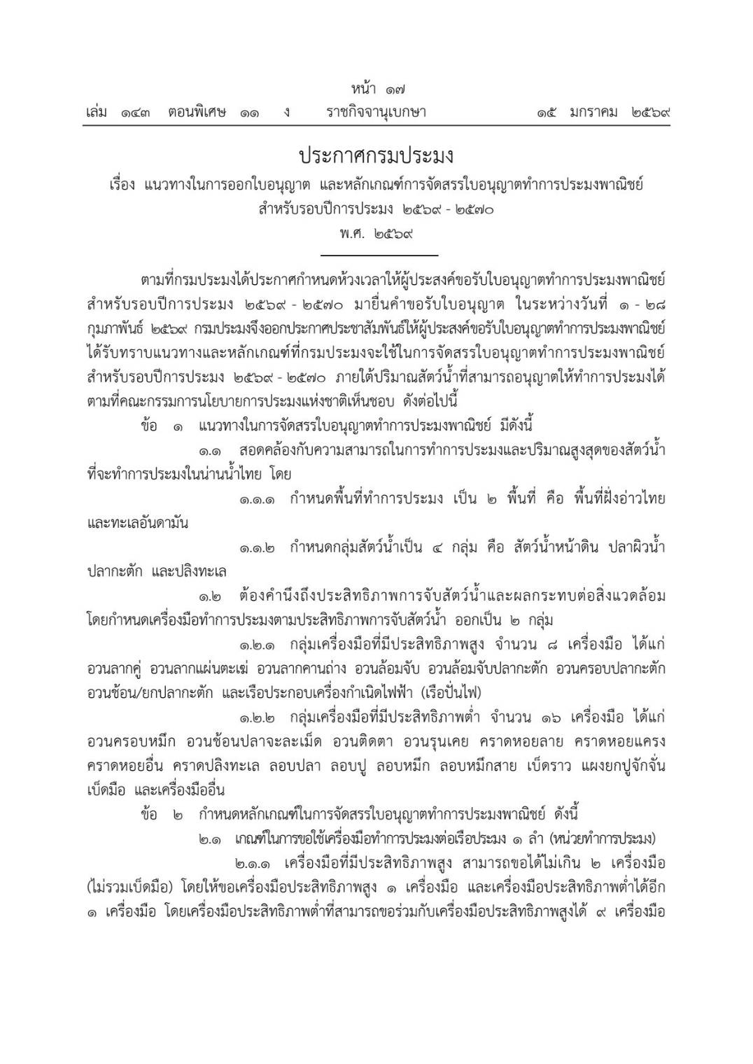 1. ประกาศกรมประมง เรื่อง กำหนดห้วงเวลา หลักเกณฑ์ วิธีการ ขั้นตอน และเงื่อนไข การขอรับใบอนุญาตทำการประมงพาณิชย์ สำหรับรอบปีการประมง 2569 - 2570 พ.ศ. 2569