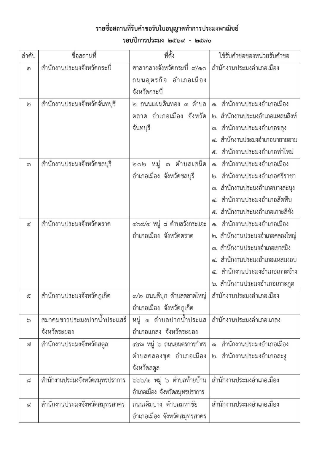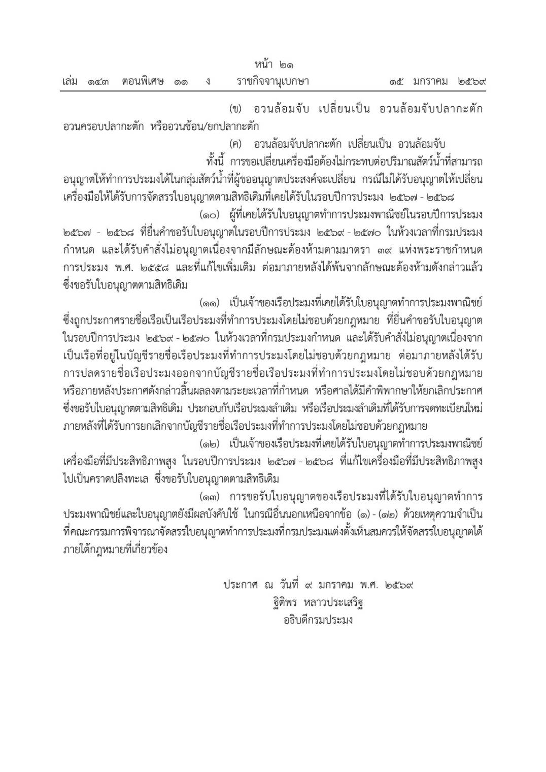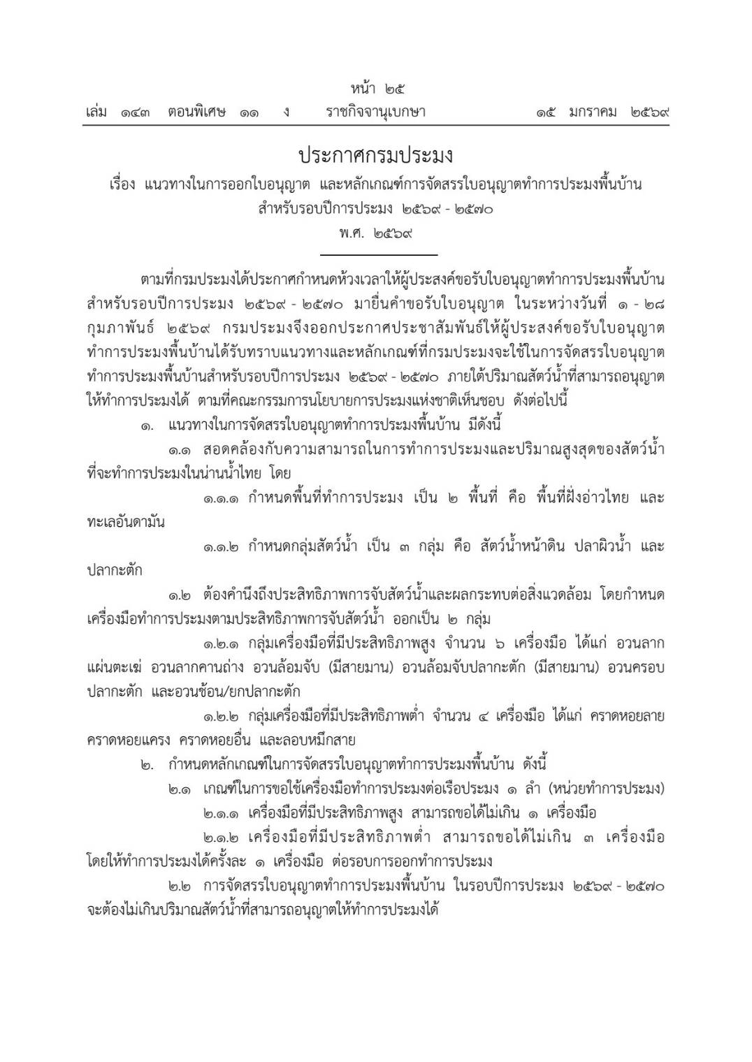 1. ประกาศกรมประมง เรื่อง กำหนดห้วงเวลา หลักเกณฑ์ วิธีการ ขั้นตอน และเงื่อนไข การขอรับใบอนุญาตทำการประมงพาณิชย์ สำหรับรอบปีการประมง 2569 - 2570 พ.ศ. 2569