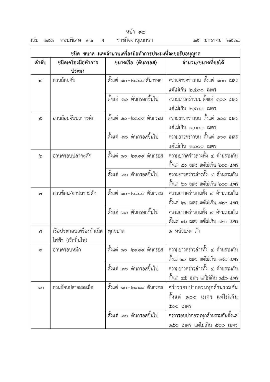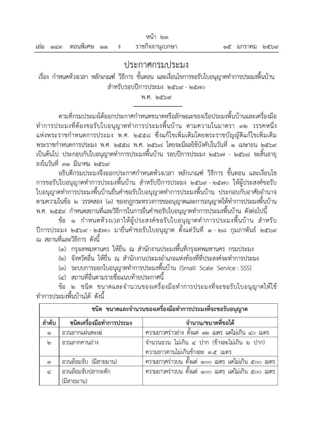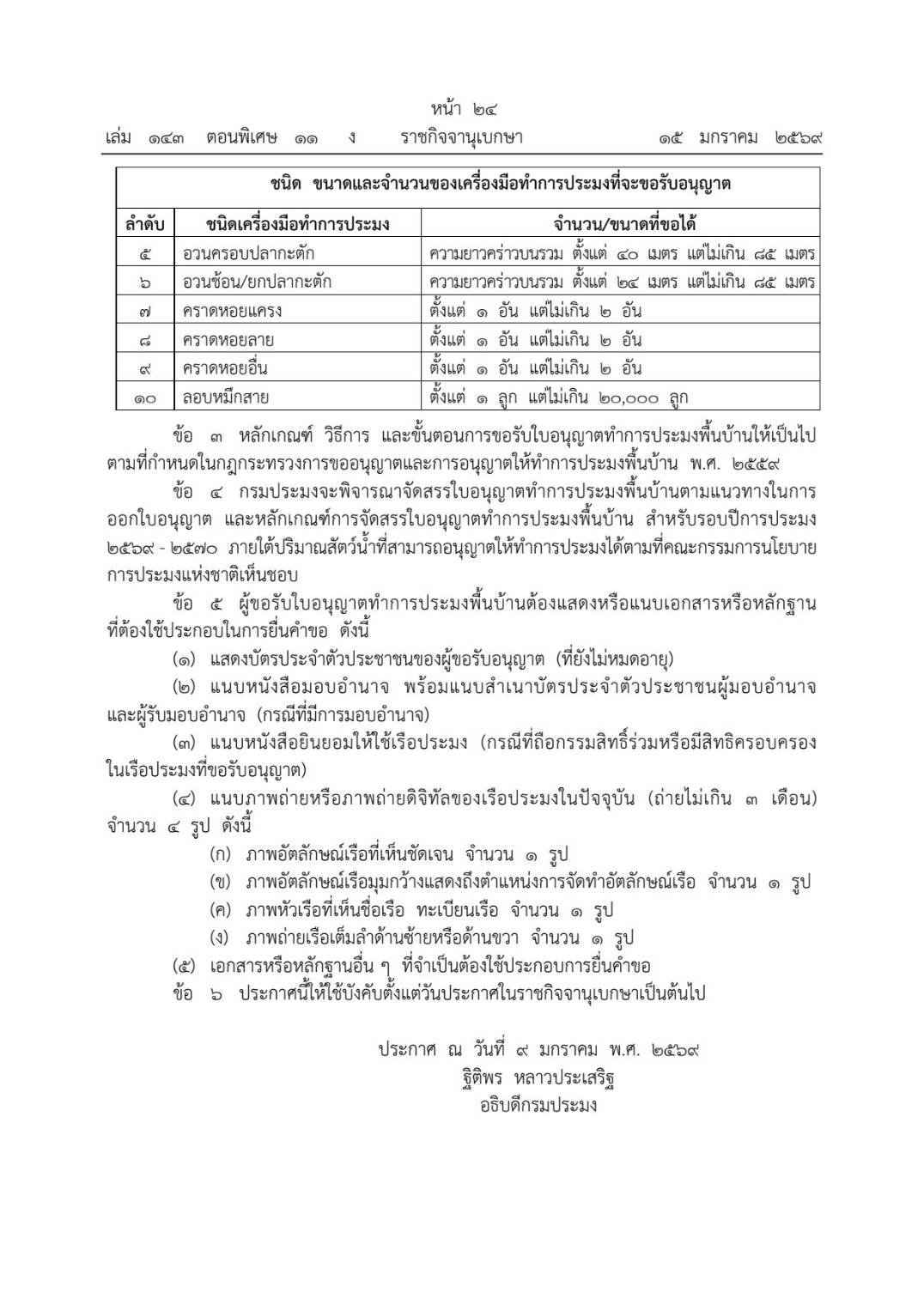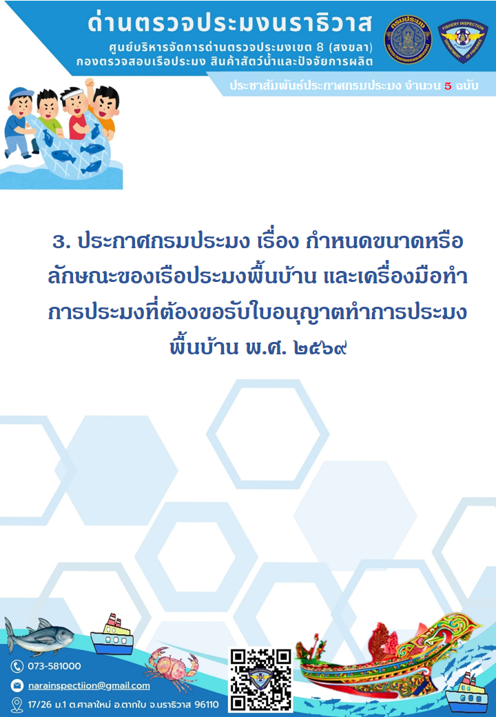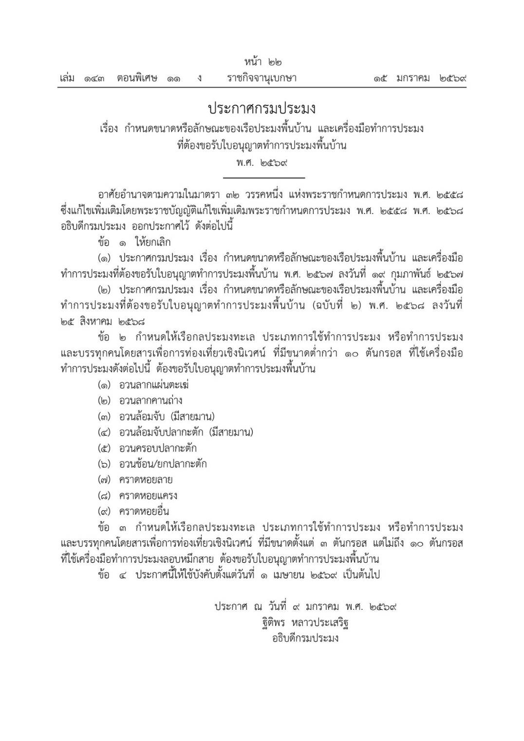 3. ประกาศกรมประมง เรื่อง กำหนดขนาดหรือลักษณะของเรือประมงพื้นบ้าน และเครื่องมือ ทำการประมงที่ต้องขอรับใบอนุญาตทำการประมงพื้นบ้าน พ.ศ. 2569