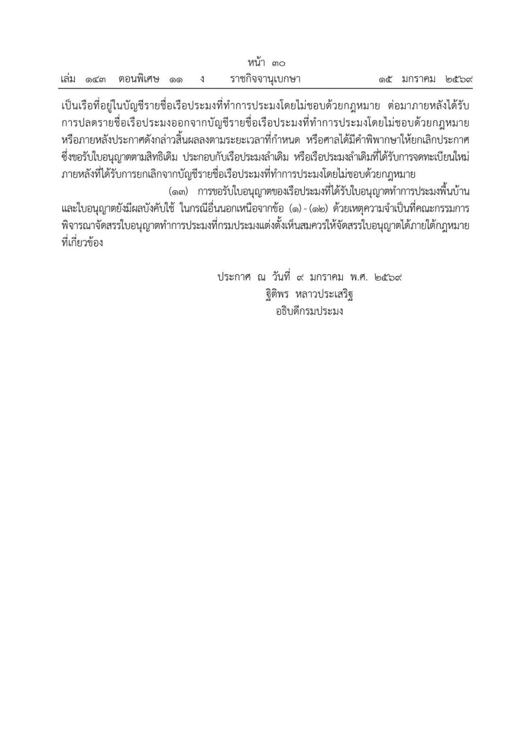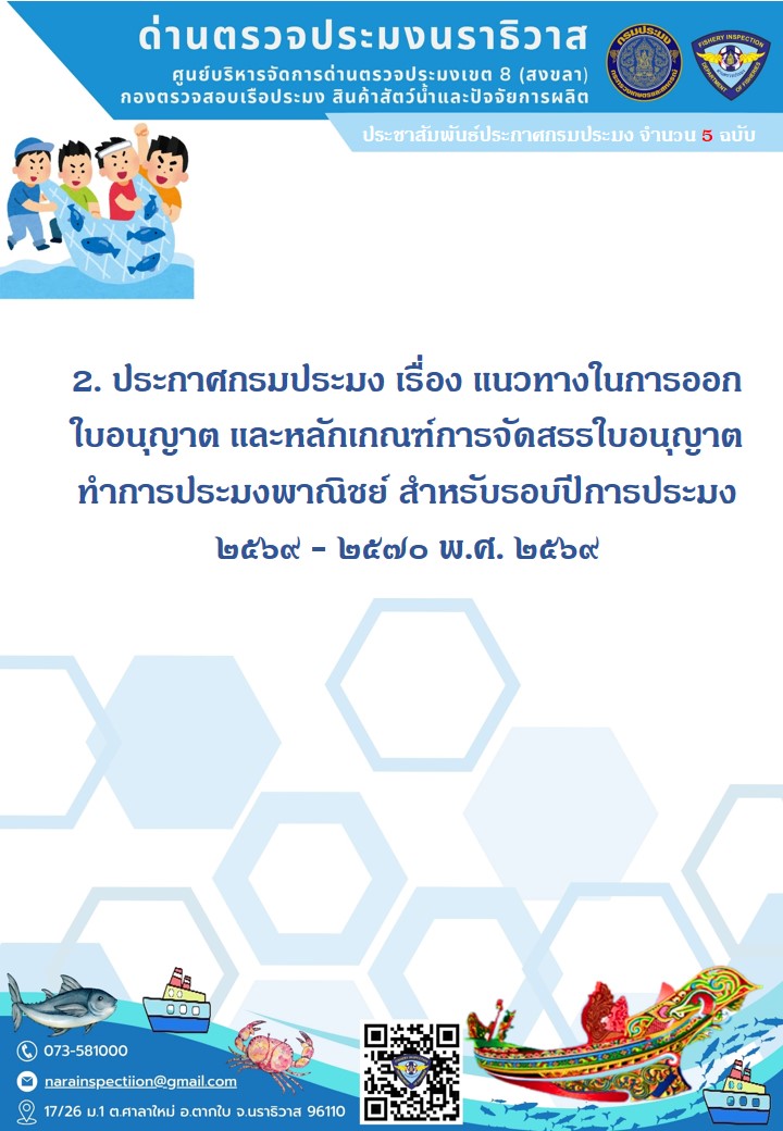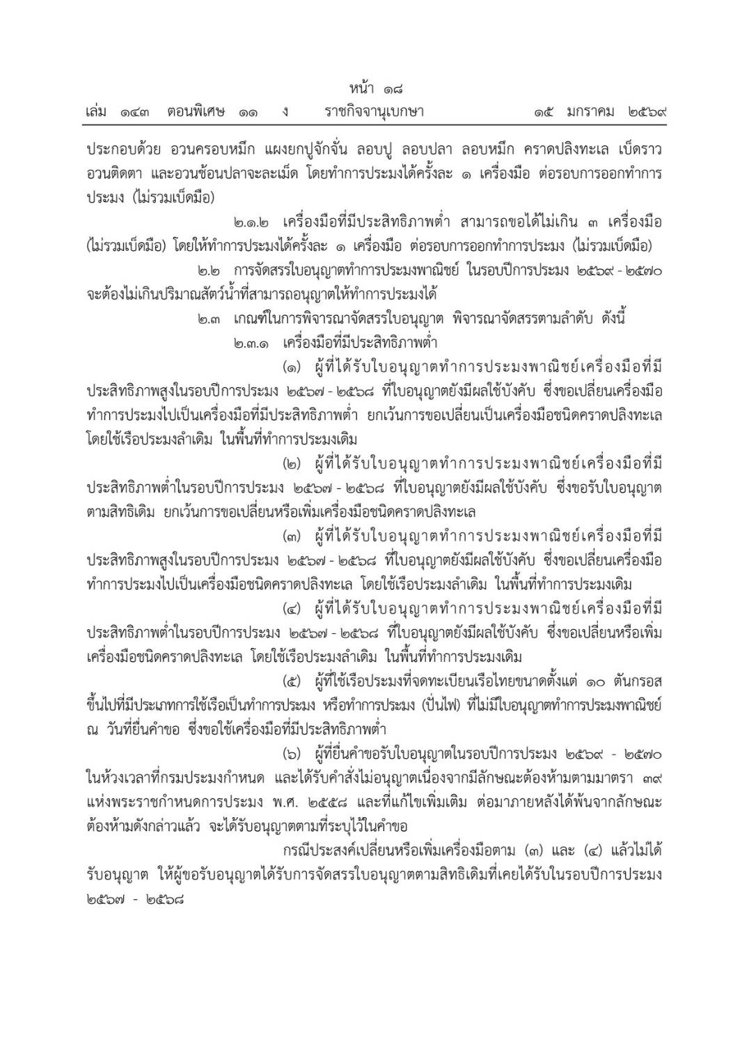 2. ประกาศกรมประมง เรื่อง แนวทางในการออกใบอนุญาต และหลักเกณฑ์การจัดสรรใบอนุญาต ทำการประมงพาณิชย์ สำหรับรอบปีการประมง 2569 - 2530 พ.ศ. 2569