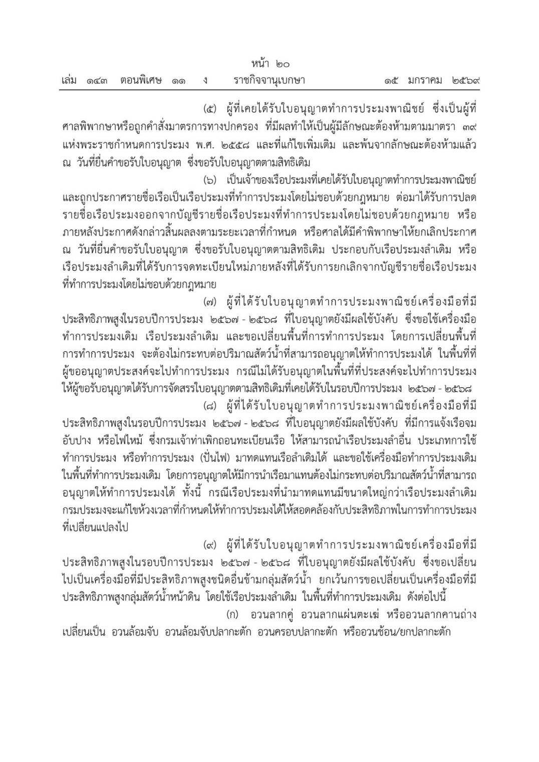 4. ประกาศกรมประมง เรื่อง กำหนดห้วงเวลา หลักเกณฑ์ วิธีการ ขั้นตอน และเงื่อนไข การขอรับใบอนุญาตทำการประมงพื้นบ้าน สำหรับรอบปีการประมง 2569 - 2570 พ.ศ. 2569