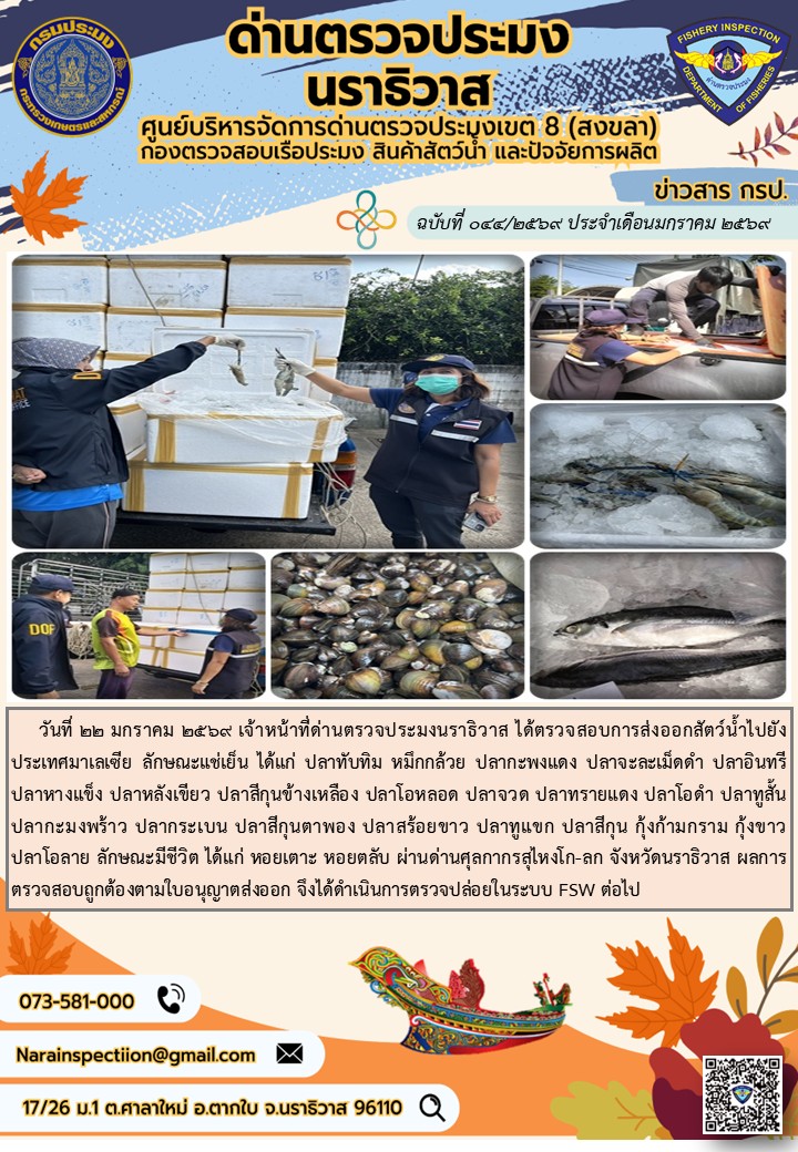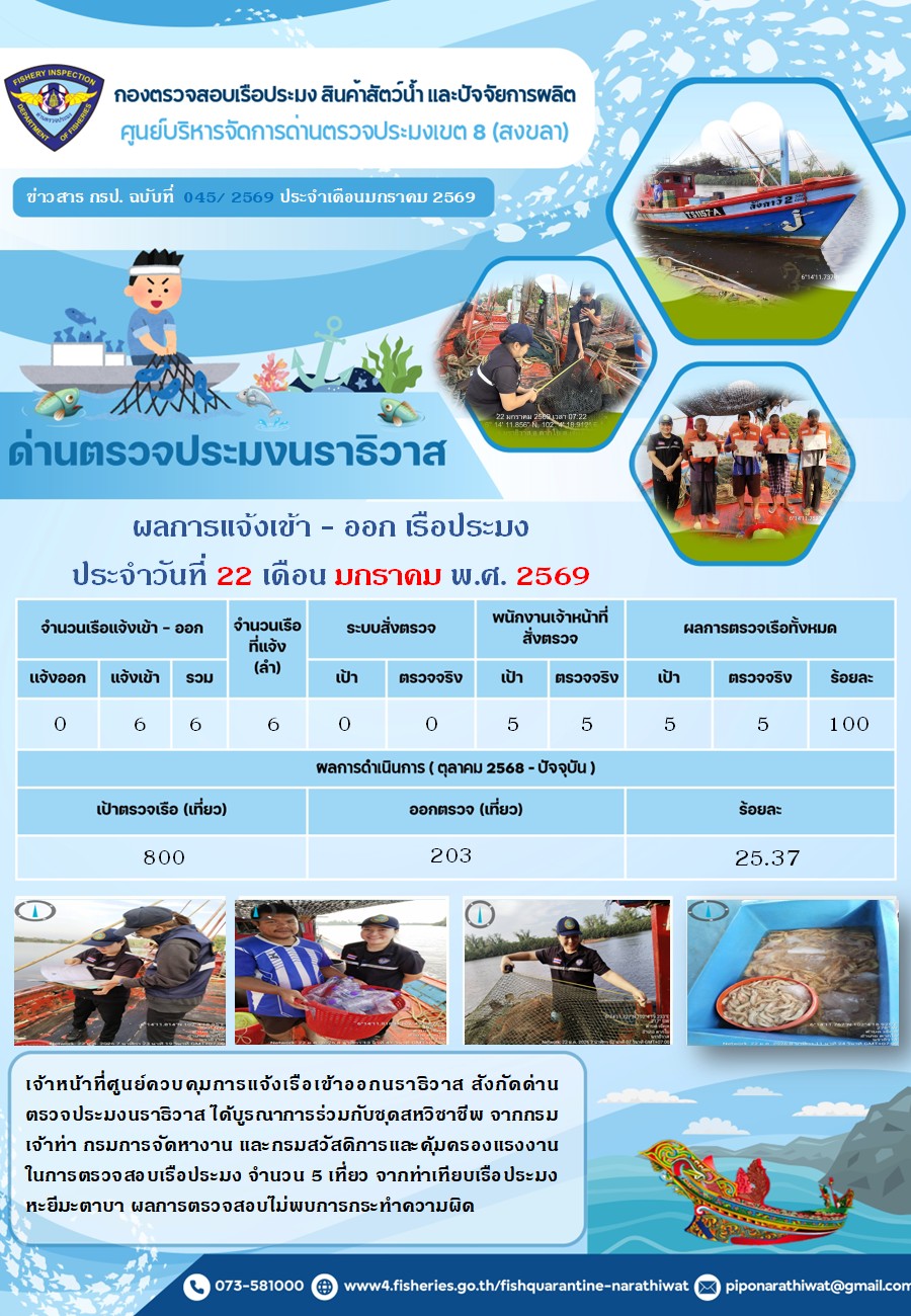 ประชาสัมพันธ์ด่านตรวจประมงนราธิวาส ประจำวันที่ 22 มกราคม 2569