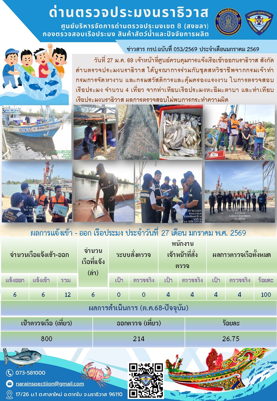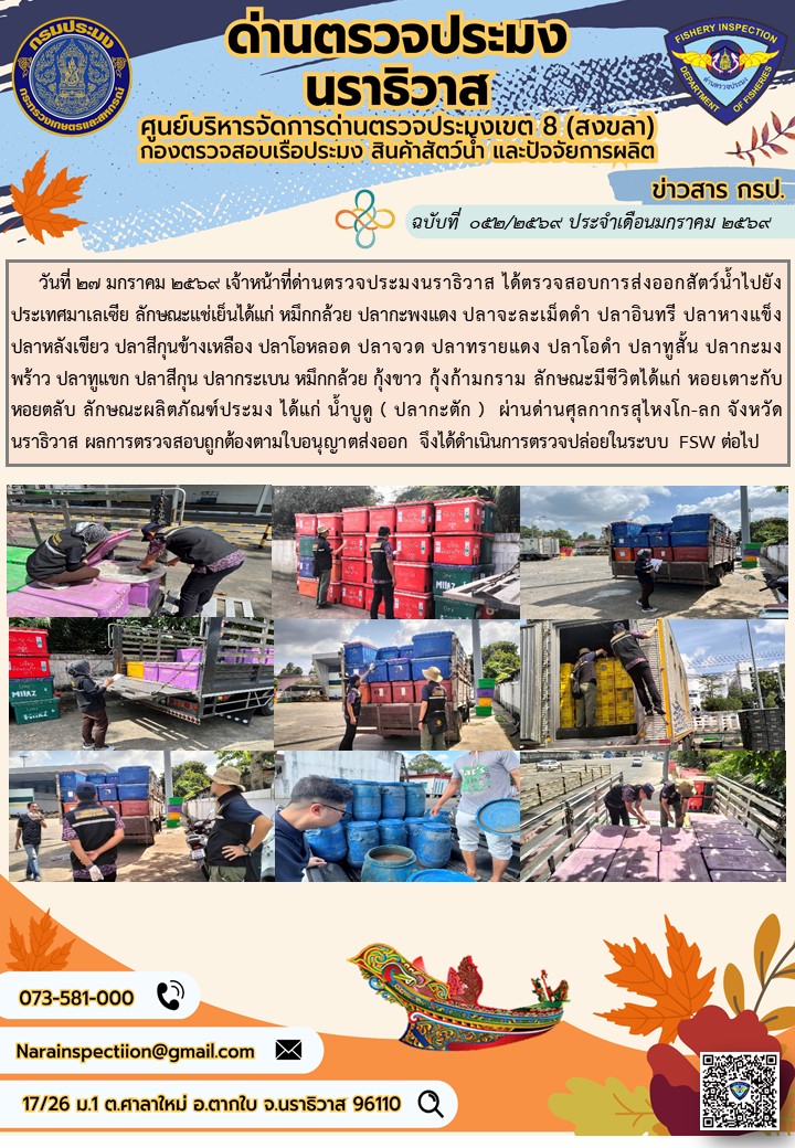 ประชาสัมพันธ์ด่านตรวจประมงนราธิวาส ประจำวันที่ 27 มกราคม 2569