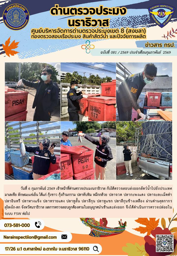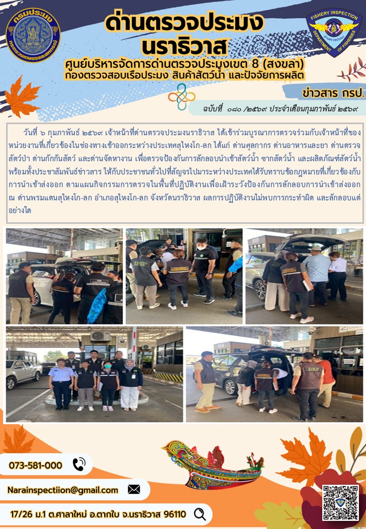 ประชาสัมพันธ์ด่านตรวจประมงนราธิวาส ประจำวันที่ 6 กุมภาพันธ์ 2569