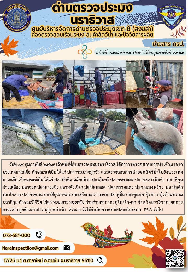 ประชาสัมพันธ์ด่านตรวจประมงนราธิวาส ประจำวันที่ 14 กุมภาพันธ์ 2569