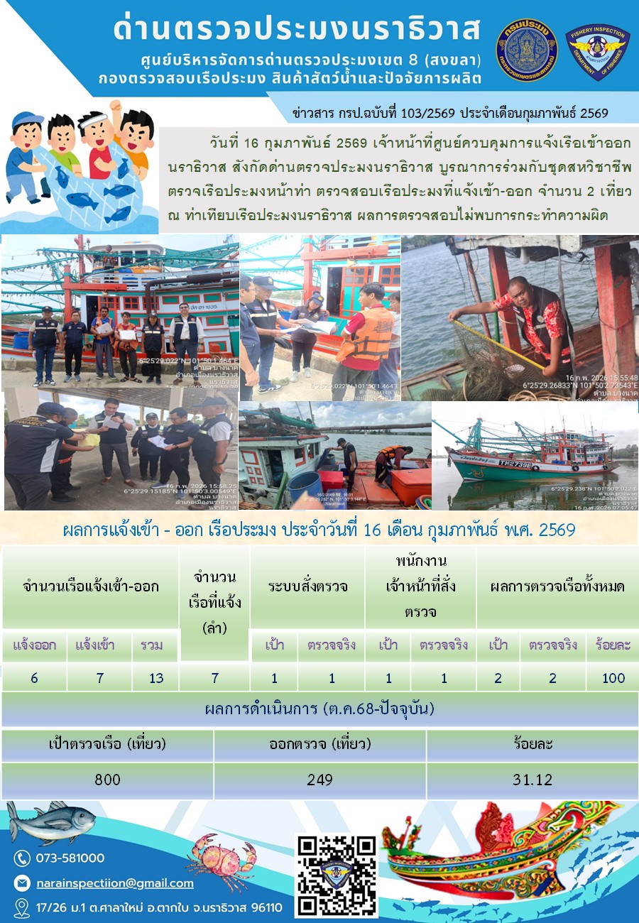 ประชาสัมพันธ์ด่านตรวจประมงนราธิวาส ประจำวันที่ 16 กุมภาพันธ์ 2569