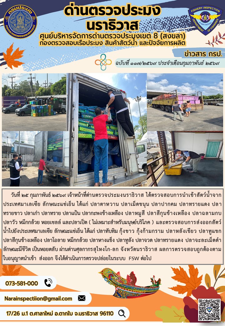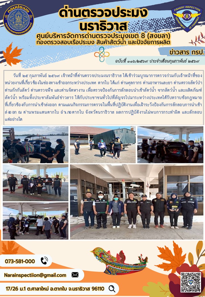 ประชาสัมพันธ์ด่านตรวจประมงนราธิวาส ประจำวันที่ 25 กุมภาพันธ์ 2569