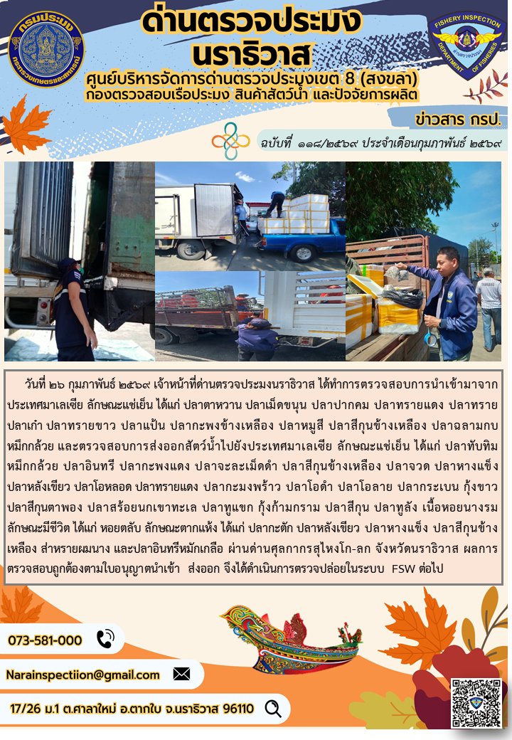 ประชาสัมพันธ์ด่านตรวจประมงนราธิวาส ประจำวันที่ 26 กุมภาพันธ์ 2569