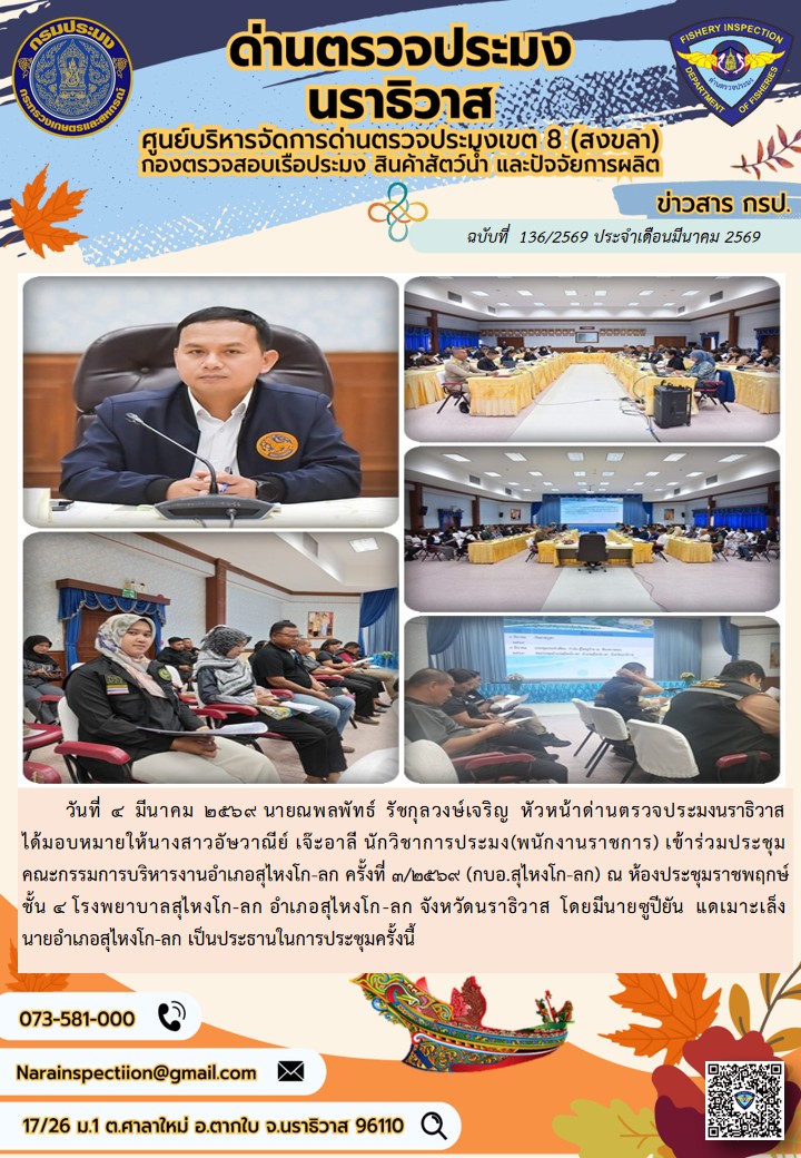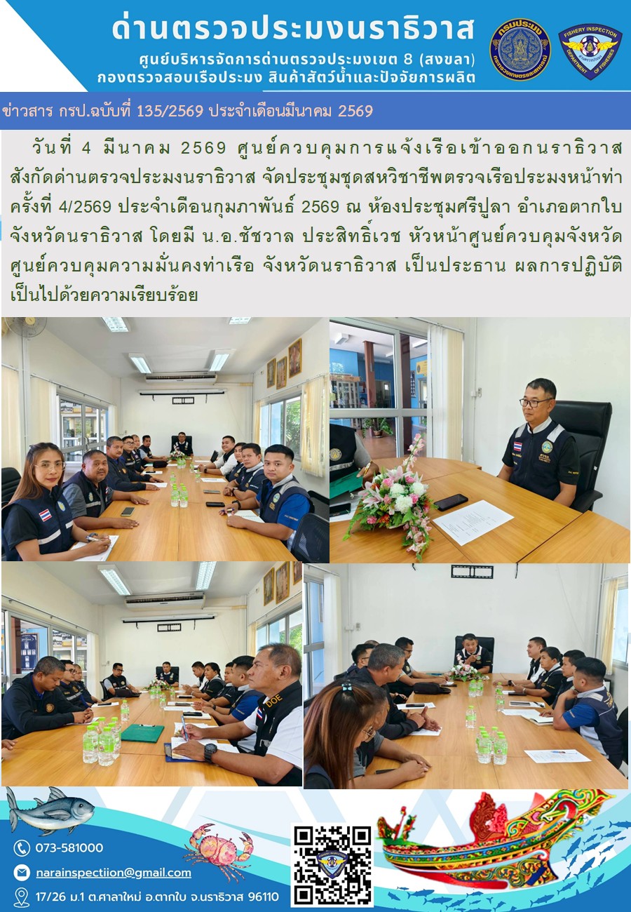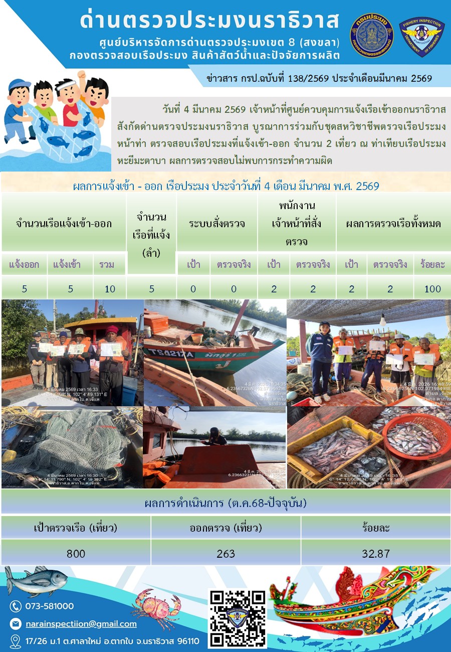 ประชาสัมพันธ์ด่านตรวจประมงนราธิวาส ประจำวันที่ 4 มีนาคม 2569