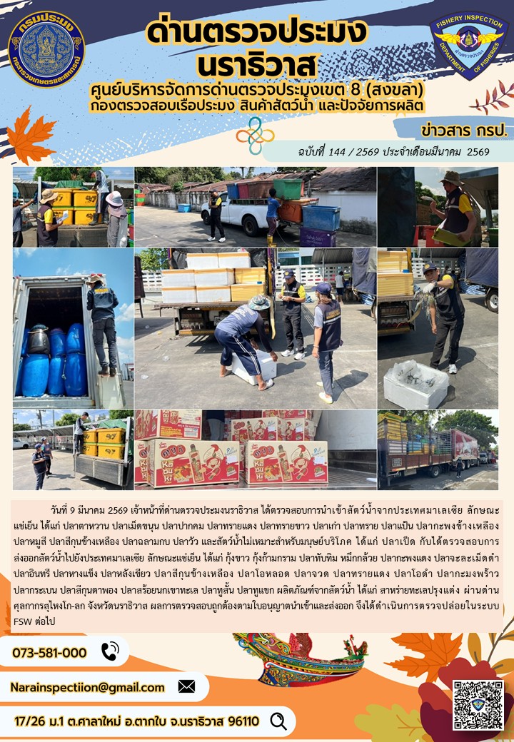 ประชาสัมพันธ์ด่านตรวจประมงนราธิวาส ประจำวันที่ 9 มีนาคม 2569